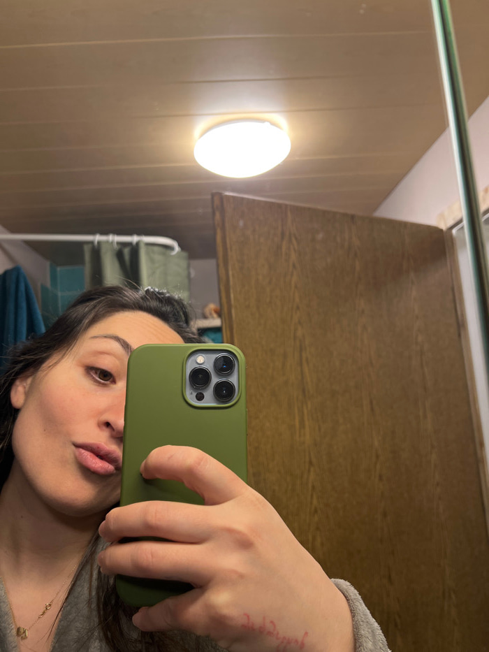 A woman takes a selfie in a bathroom mirror. She holds a green iPhone, its camera facing the mirror, obscuring part of her face. The bathroom has brown wooden cabinetry, a white wall-mounted light fix…read more