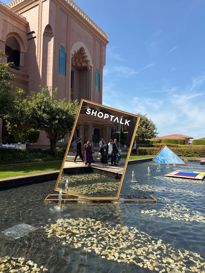 The image depicts an outdoor scene at the Emirates Palace Mandarin Oriental in Abu Dhabi, United Arab Emirates. In the foreground, a large, rectangular, gold-framed sign or mirror titled "SHOP TALK" i…read more