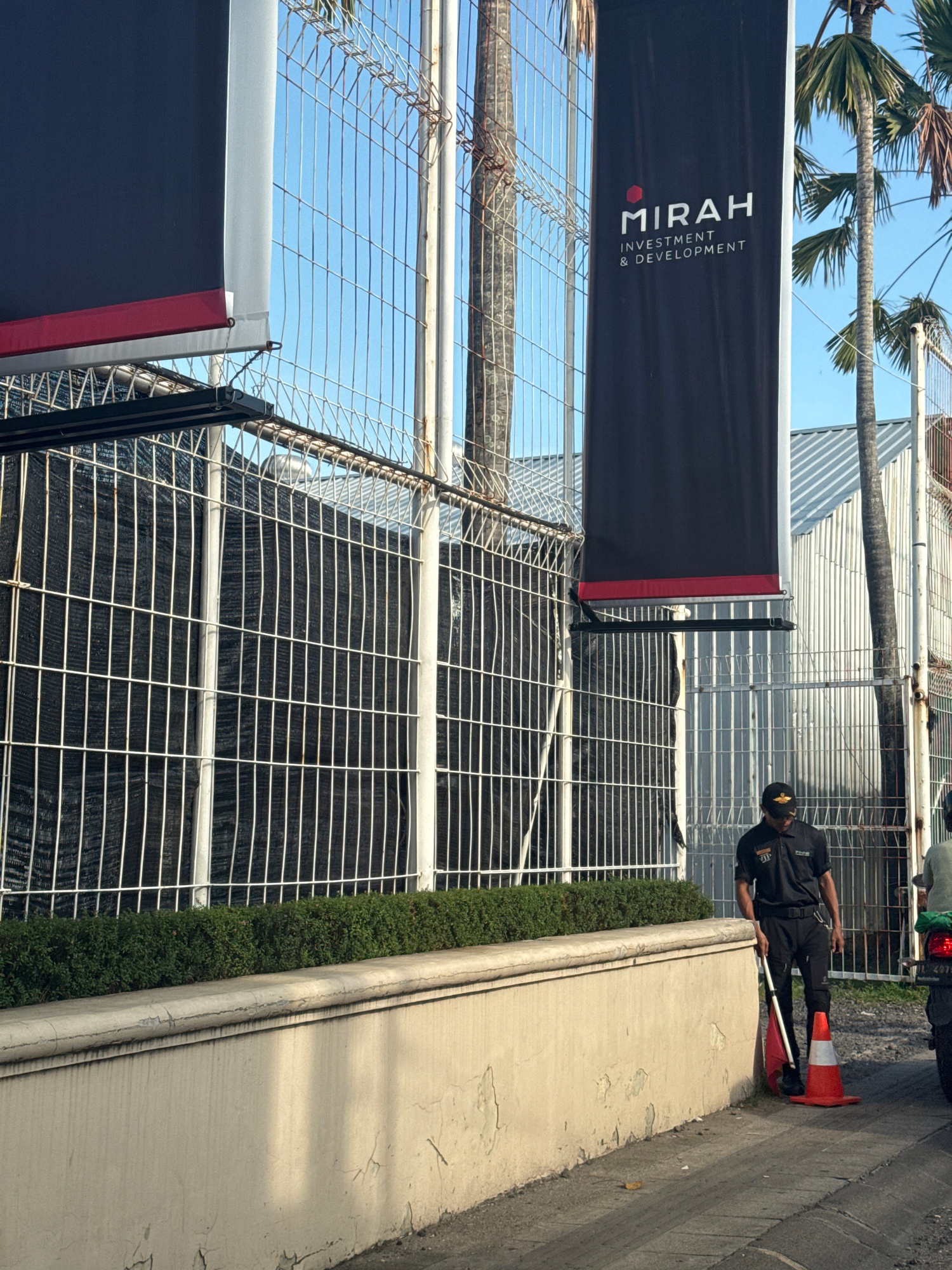 The image captures a construction site in what appears to be North Kuta, Indonesia, based on the "Mirah Investment & Development" banner displayed prominently on the fence. A security guard is standin…read more