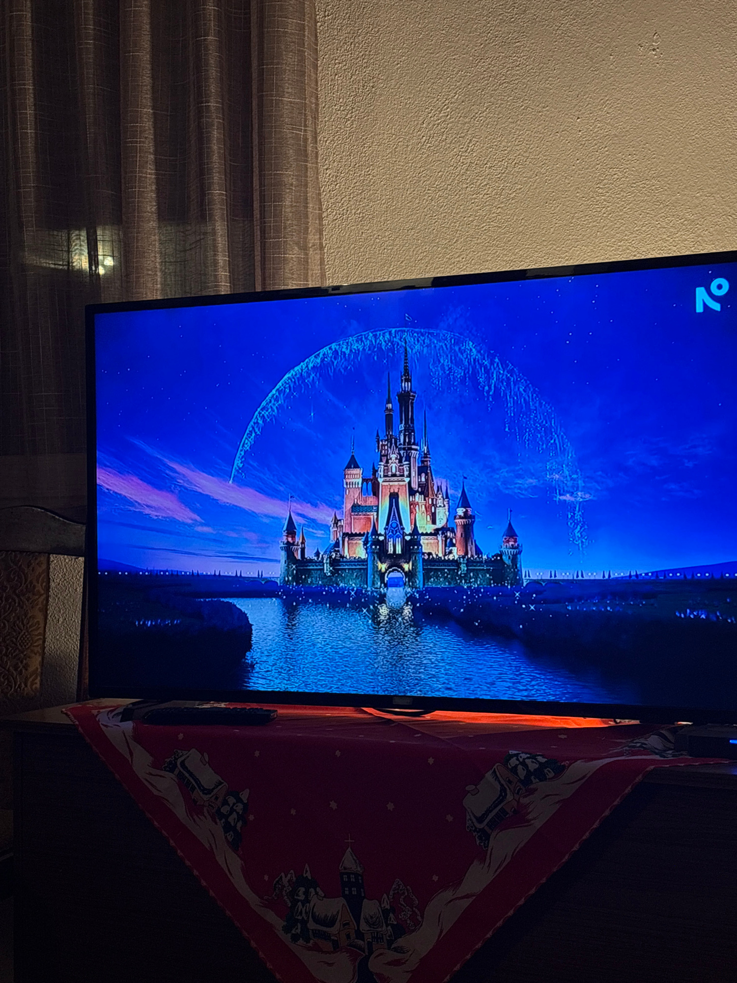 The image shows a television screen displaying an animated scene of a castle, potentially from a Disney film. The scene has a blue color scheme and features a castle surrounded by a glowing, semi-circ…read more