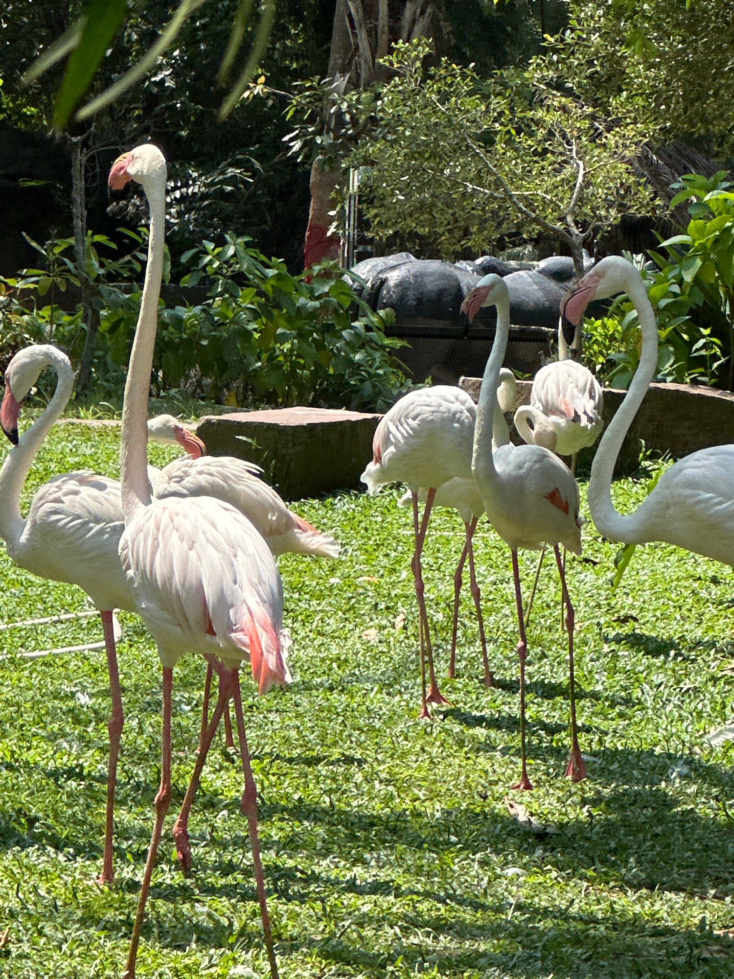 The photograph captures a group of flamingos in Bang Phra Subdistrict, Thailand. The birds are positioned on a grassy area, some standing tall with their necks extended and others with their heads tuc…read more