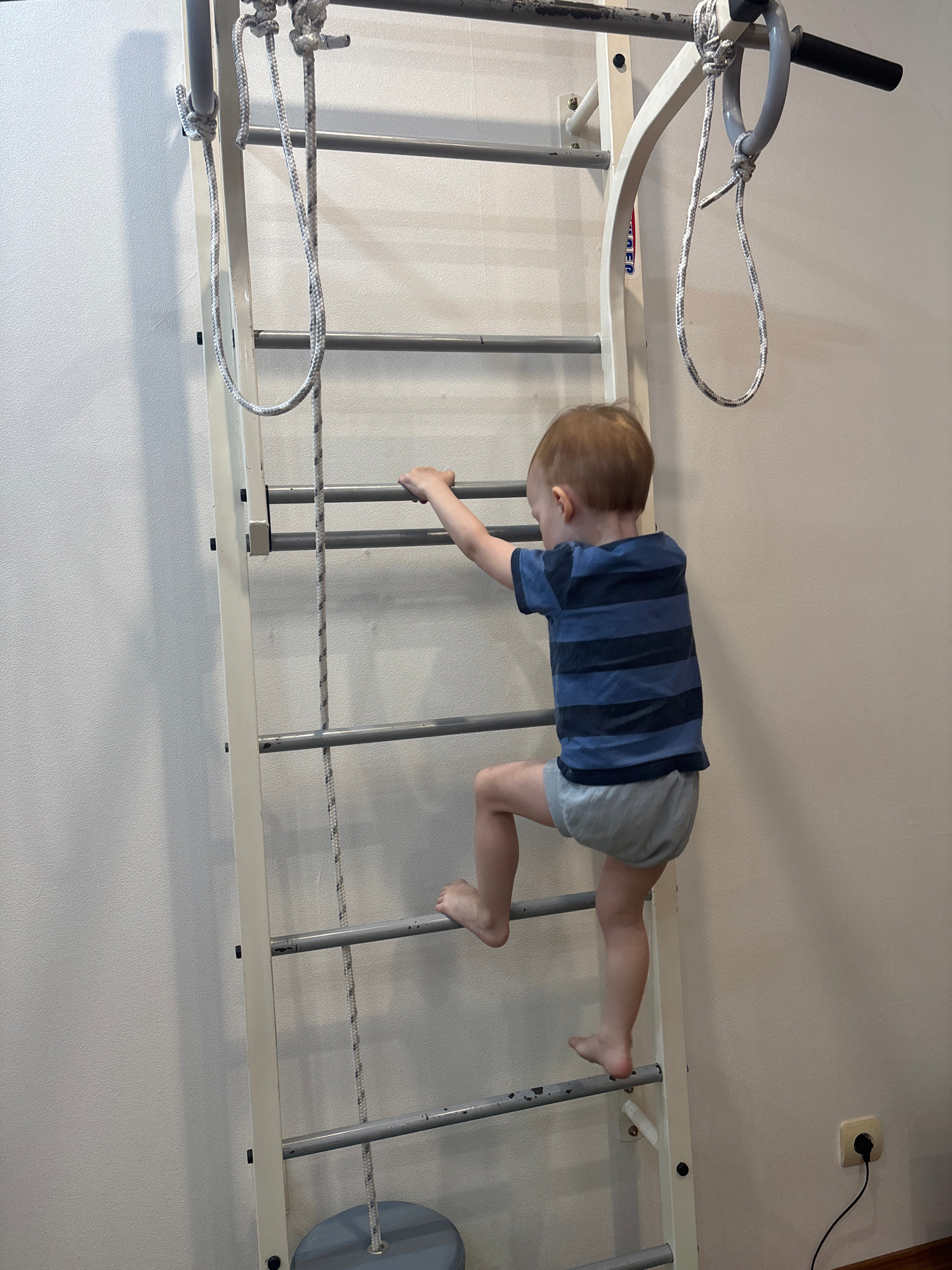 A child is climbing a wall-mounted Swedish ladder apparatus in a room. The child, wearing a striped blue shirt and grey shorts, is mid-climb, using both hands and feet on the rungs. The ladder is made…read more