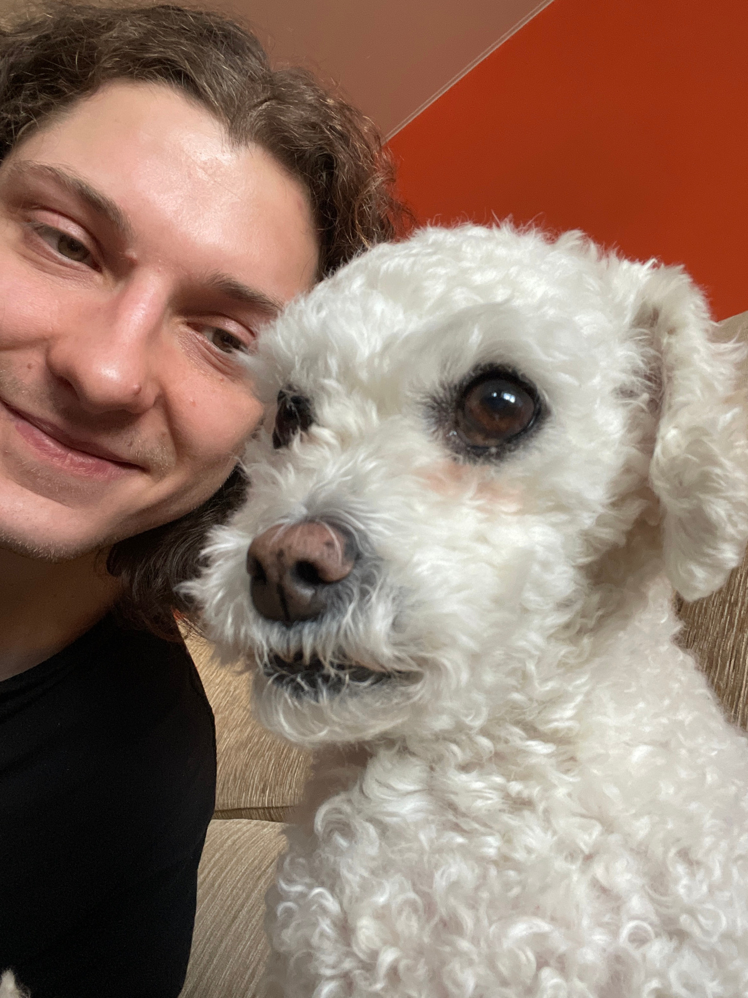 A selfie-style photograph shows a man with long, wavy brown hair smiling into the camera. Above him and slightly to the right is a white, fluffy dog, possibly a Bichon Frise or similar breed, with its…read more