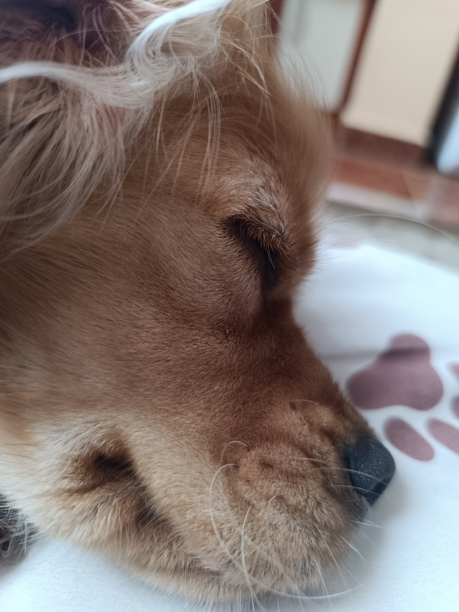 A close-up shot shows the head of a sleeping dog. The dog is light brown with long fur around its face and ears. Its eye is closed. The dog rests on a white surface with pink paw prints. The setting a…read more