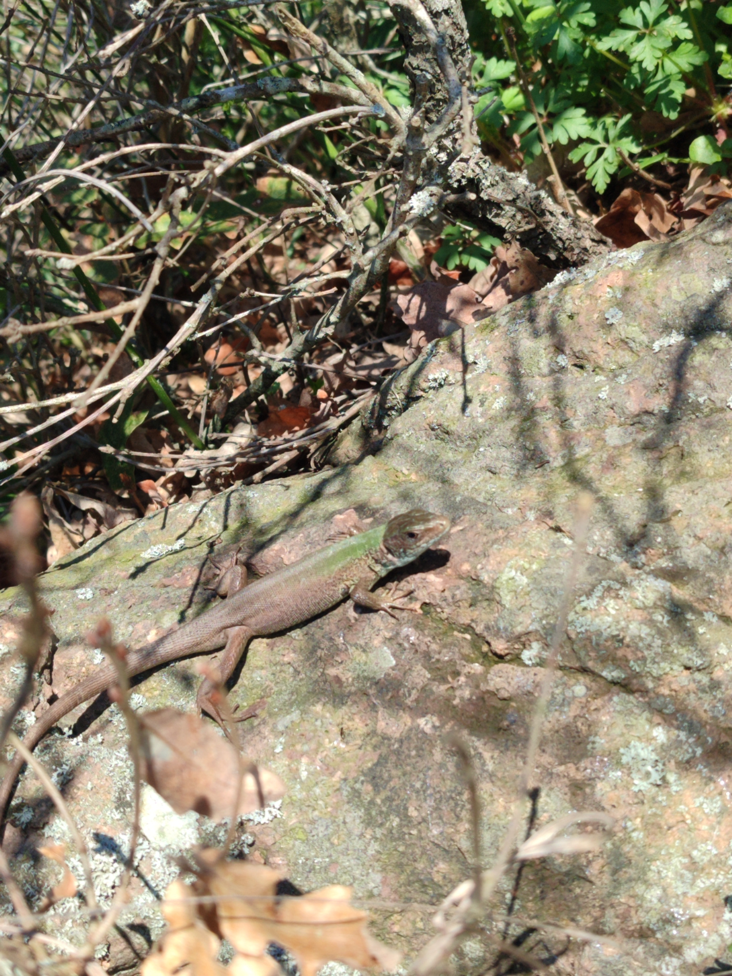 A lizard is on a mossy rock in a wooded area. Dry leaves and twigs are scattered around the rock. Green foliage is visible in the background. The image was taken in Burgas, Bulgaria.