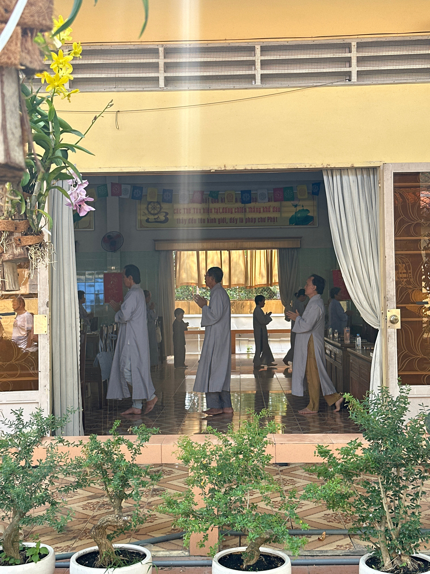 The image shows a religious ceremony or gathering inside a building, possibly a temple or a religious hall, with people in gray robes bowing in prayer. The scene is framed by a doorway or a large wind…read more