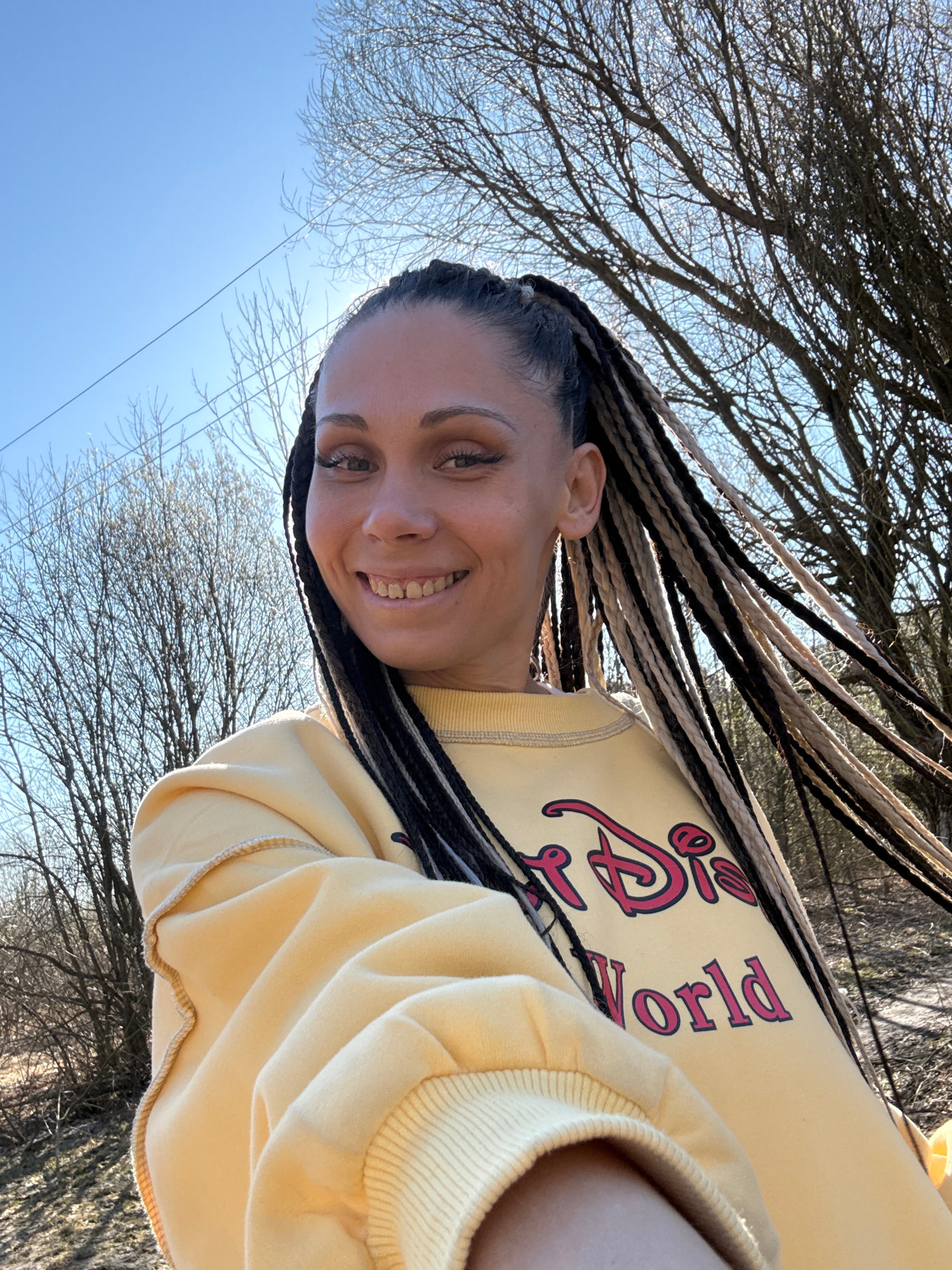 A woman with black and blonde braided hair is smiling into the camera. She is wearing a light yellow sweatshirt that has a red design and text on it. Behind her is a view of bare tree branches againstβ¦read more
