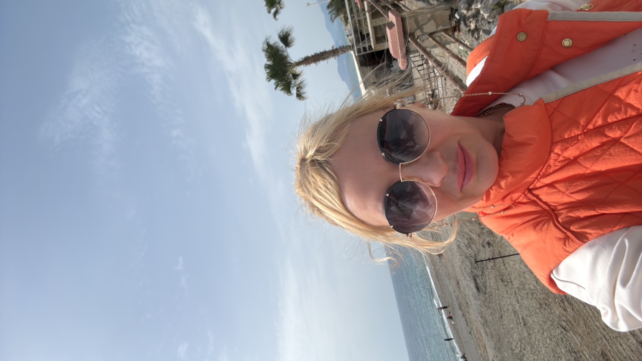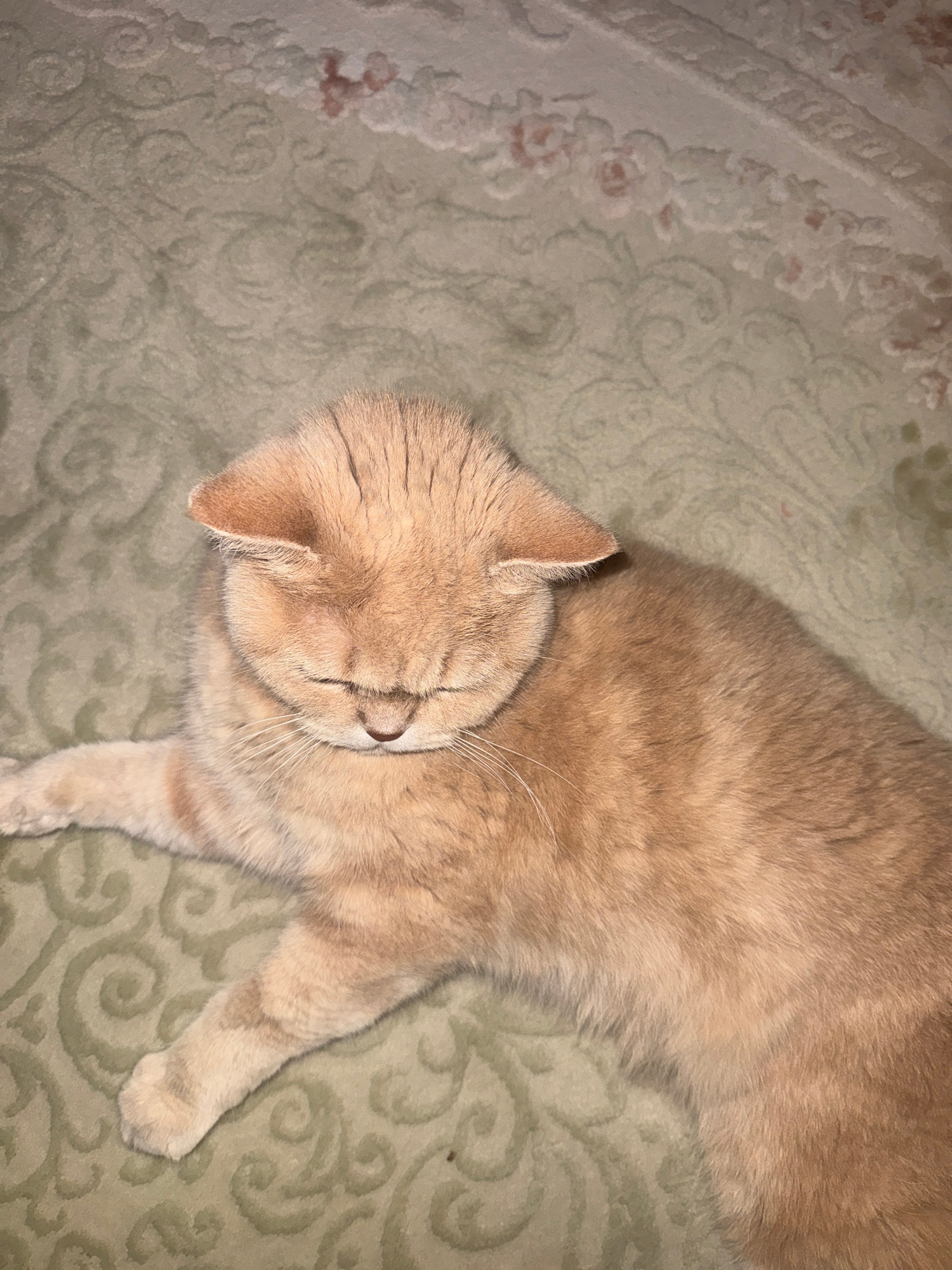 The image shows a close-up, overhead shot of a light orange cat lying on a patterned rug. The cat is mostly in the right half of the frame, with its head angled towards the left. Its eyes are closed,…read more