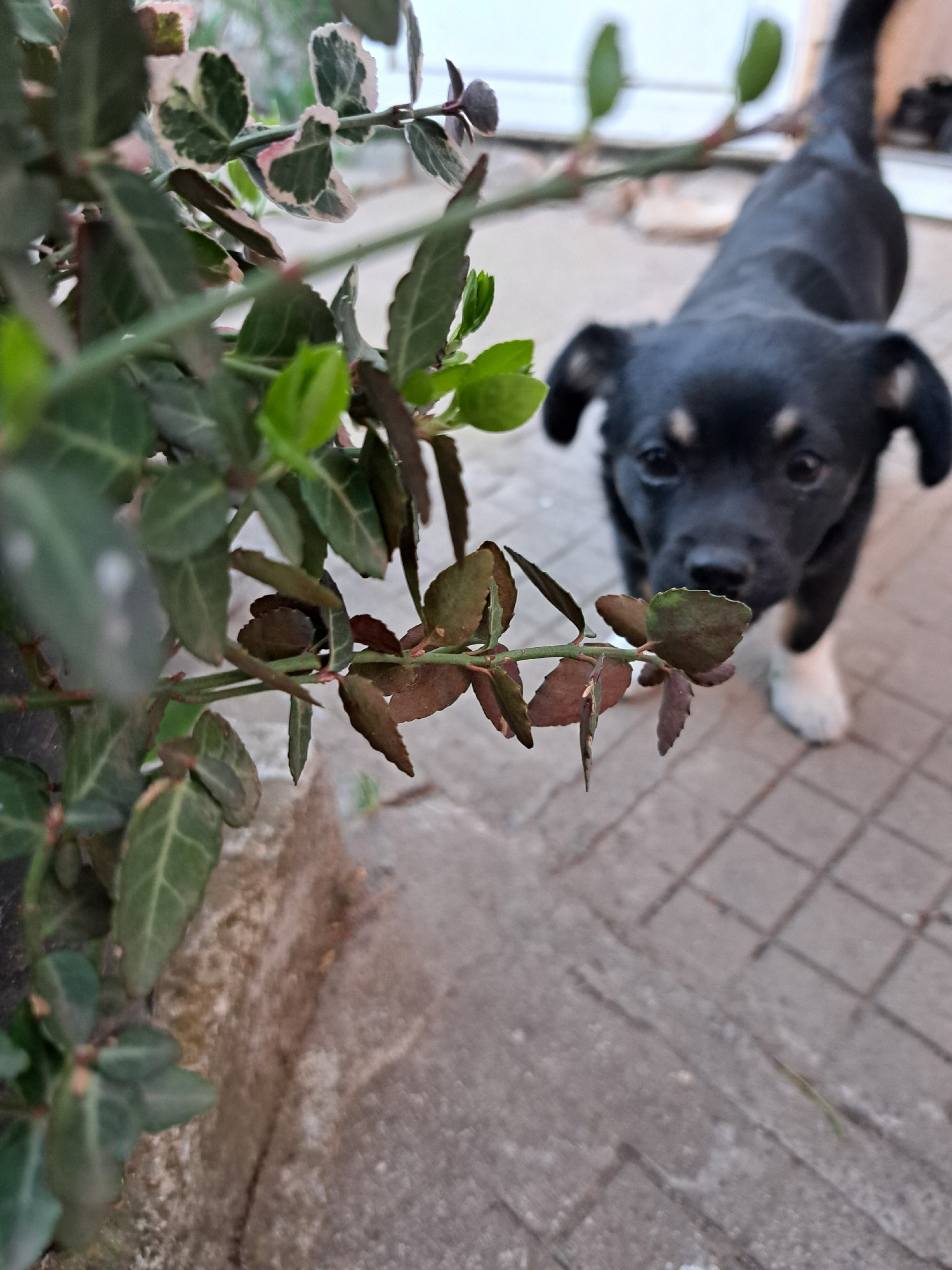 The image shows a black and tan puppy lying on a concrete surface. A plant with green and maroon leaves is in the foreground. The location is Chepintsi, Bulgaria. The puppy appears to be looking at th…read more