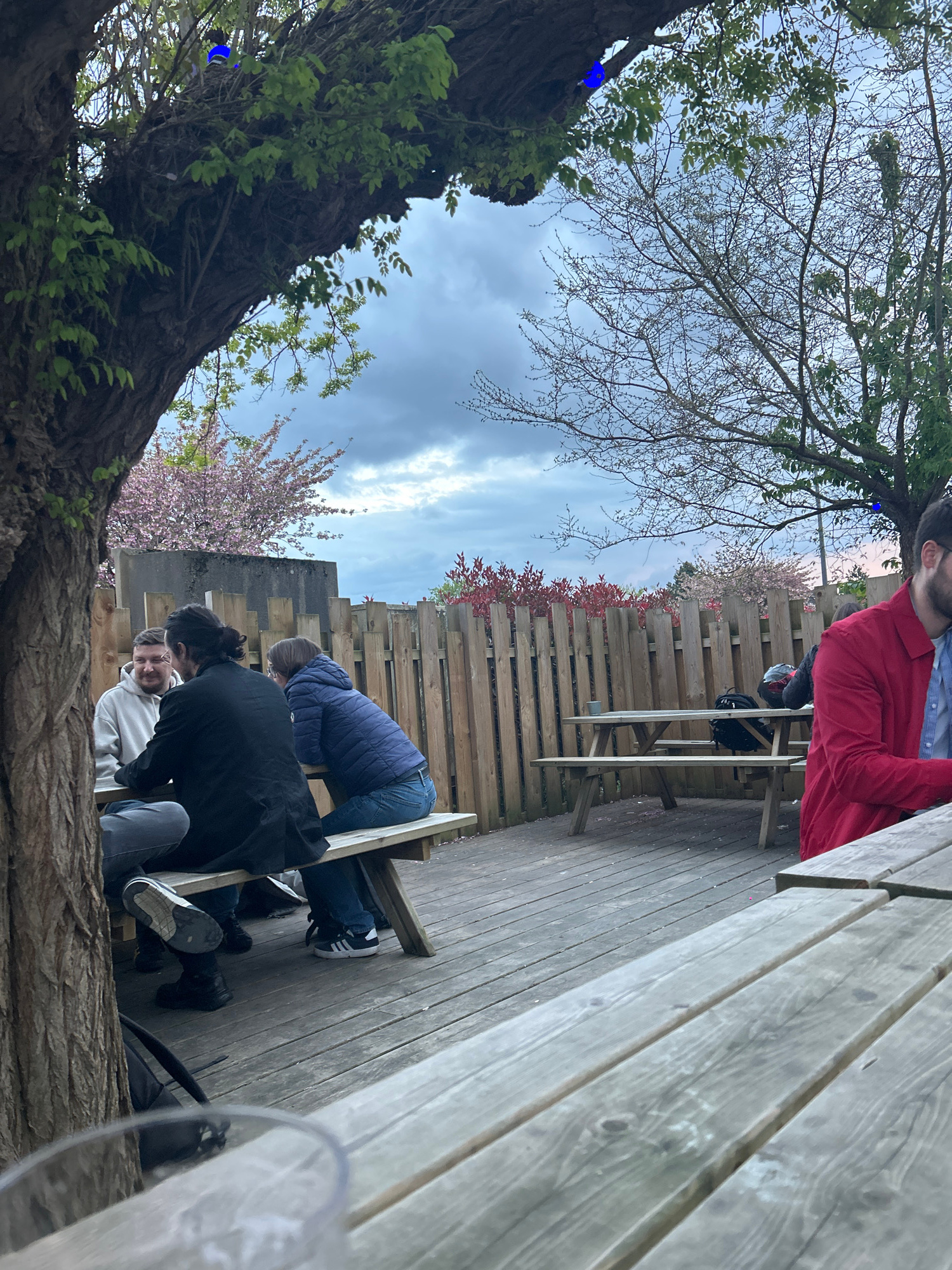 The image, taken in Villeneuve-d'Ascq, France, depicts an outdoor scene at what appears to be a pub or restaurant with a wooden deck. Several people are seated at wooden picnic tables. A man in a red…read more