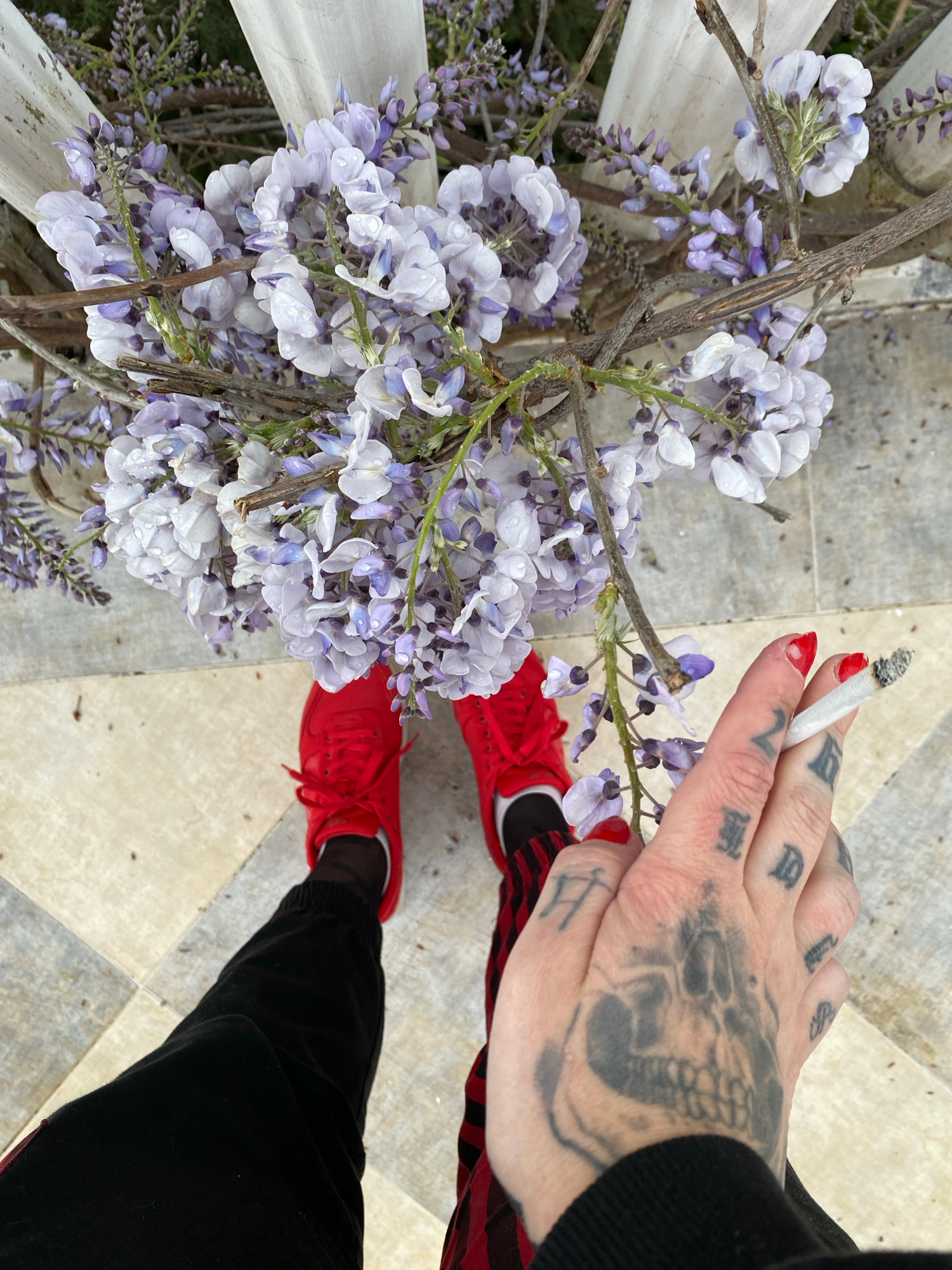 An overhead photograph in Kunje, Montenegro, captures a partial view of a person standing on a tiled surface amidst flowering wisteria. The individual wears black pants with a red side stripe, black s…read more
