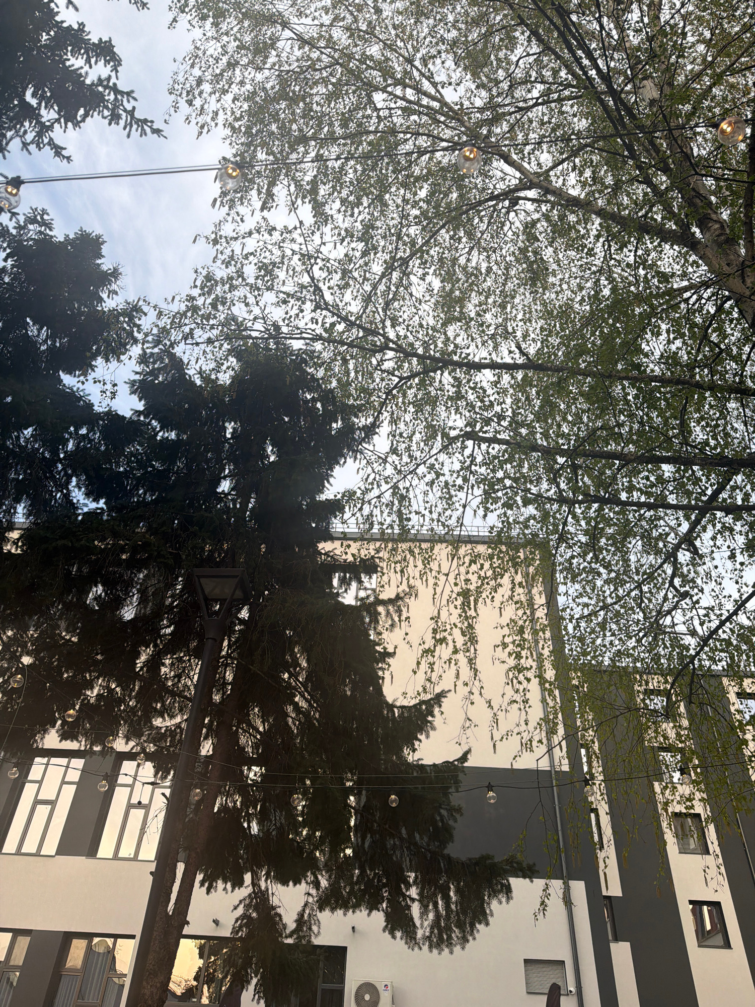 The image shows a view looking up at trees and a building. The trees have a mix of bare branches and new spring foliage. String lights are hanging from the branches. A modern building with a gray and…read more