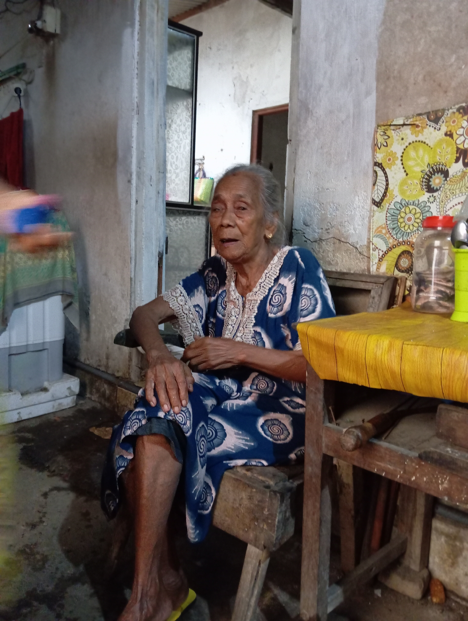 A rotated medium shot depicts an elderly woman in Baron, Indonesia. She is seated on a wooden stool, wearing a blue floral dress with lace trim, and appears to be adjusting her clothing. She has grayβ¦read more