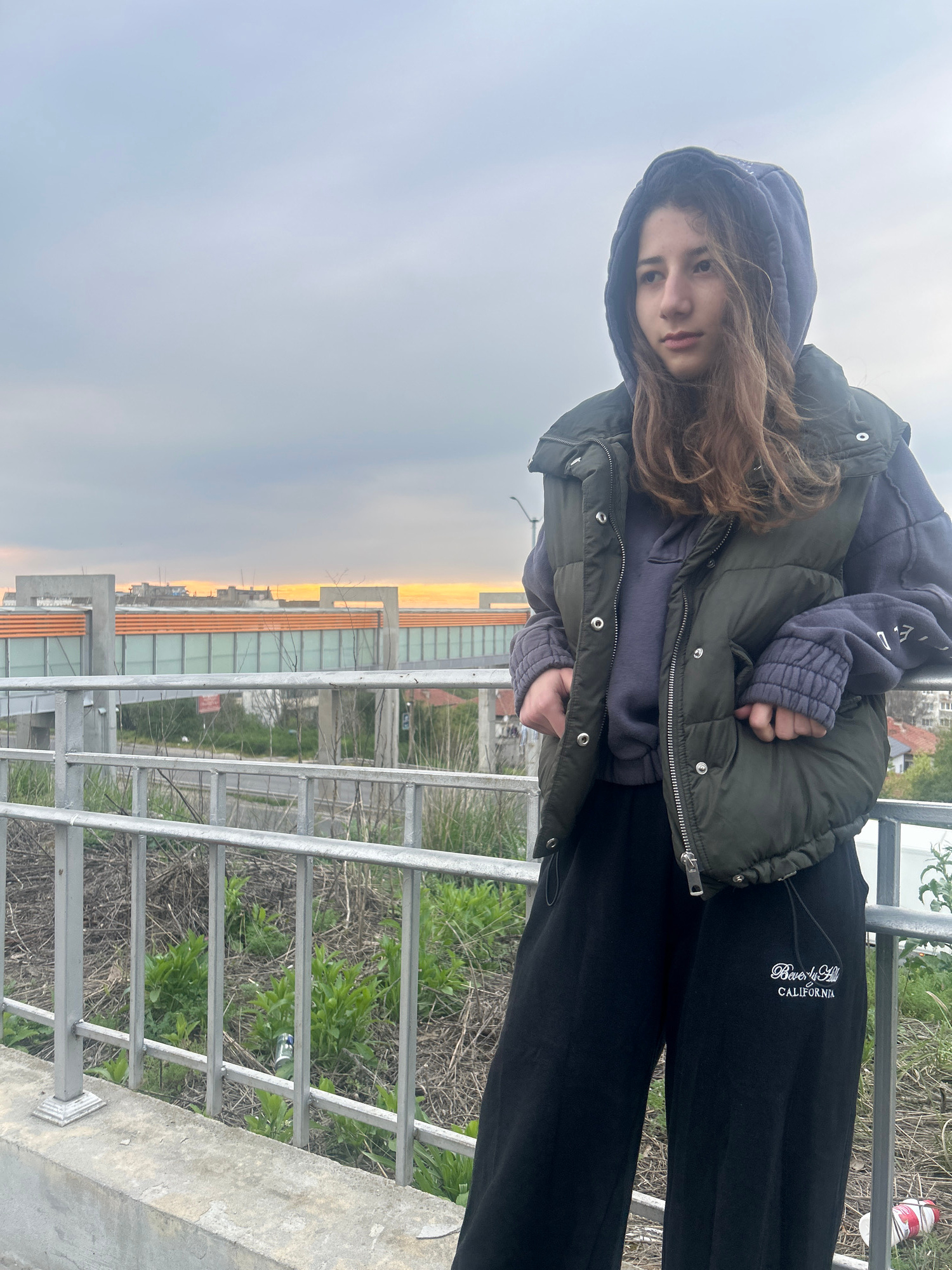 A young person, likely female, is the central subject of the image, captured in an outdoor setting during either sunset or sunrise, indicated by an orange glow on the distant horizon against an overca…read more