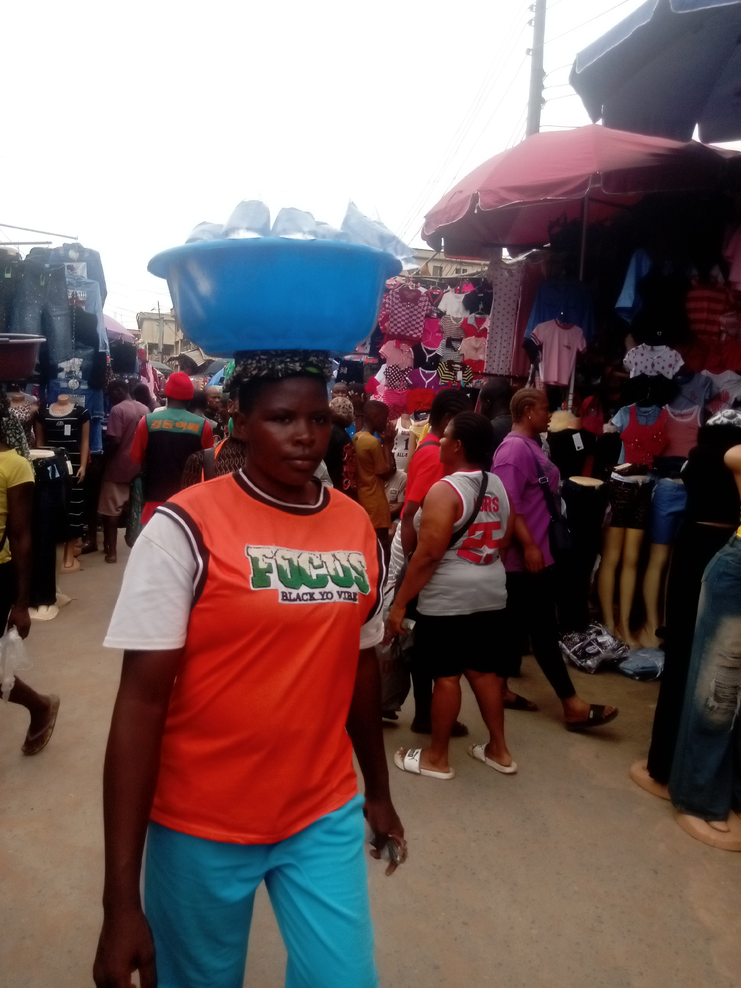 The image depicts a bustling marketplace in Fegge, Nigeria. A woman is walking toward the viewer, carrying a blue basin filled with packaged items on her head. She wears an orange t-shirt with white s…read more