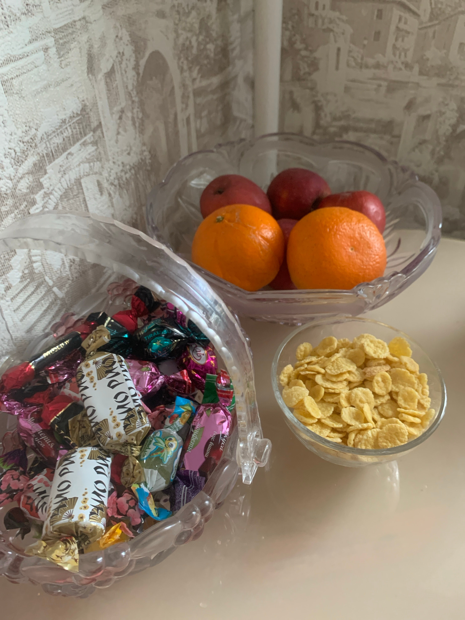 A still-life scene shows three glass bowls arranged on a surface with a patterned design. The bowl on the left contains several red apples and two oranges. The bowl in the middle contains yellow cor…read more