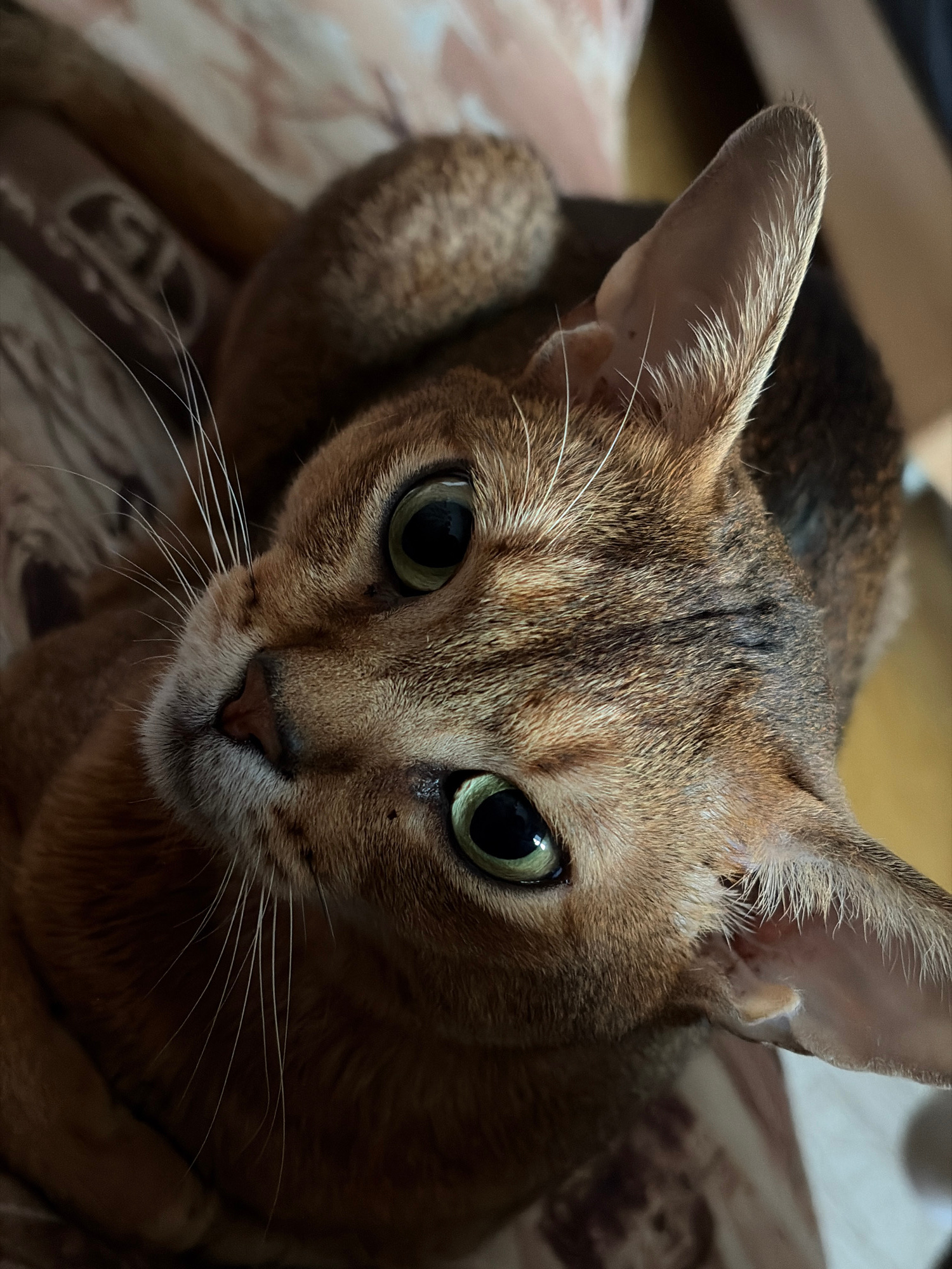 The image shows a close-up of an Abyssinian cat. The cat is sitting down, its body slightly curled. Its fur is a warm brown color with darker brown ticking. The cat has large, bright green eyes and long, white whiskers. The background is out of focus but appears to be a patterned fabric or blanket. There is no indication of this photo being taken in Chaikovsky, Russia. | Open Wire