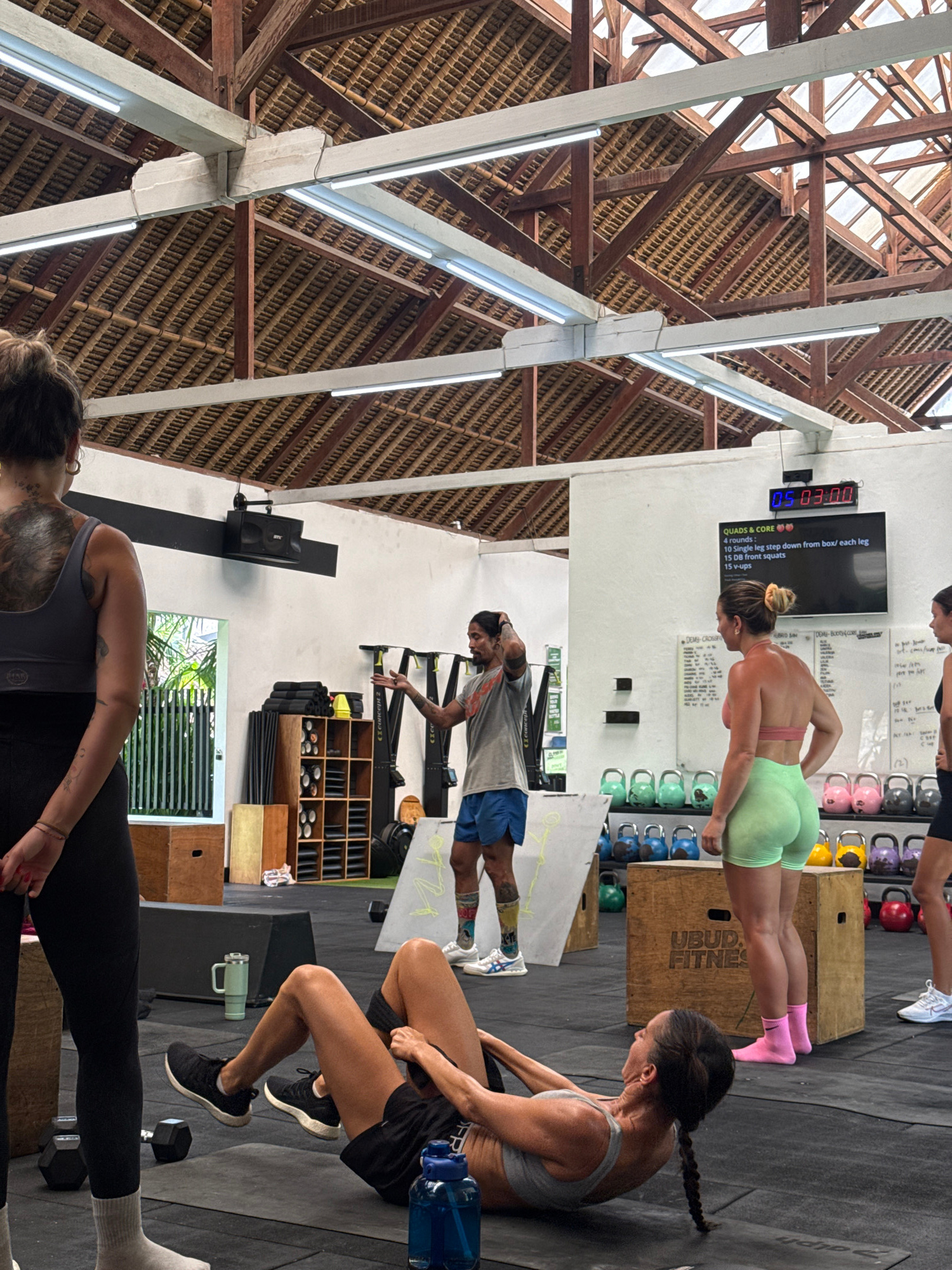 Here is a matter-of-fact description of the image: The image captures a fitness class in progress, possibly at a gym or fitness center located in the Ubud District of Indonesia, as suggested by the t…read more