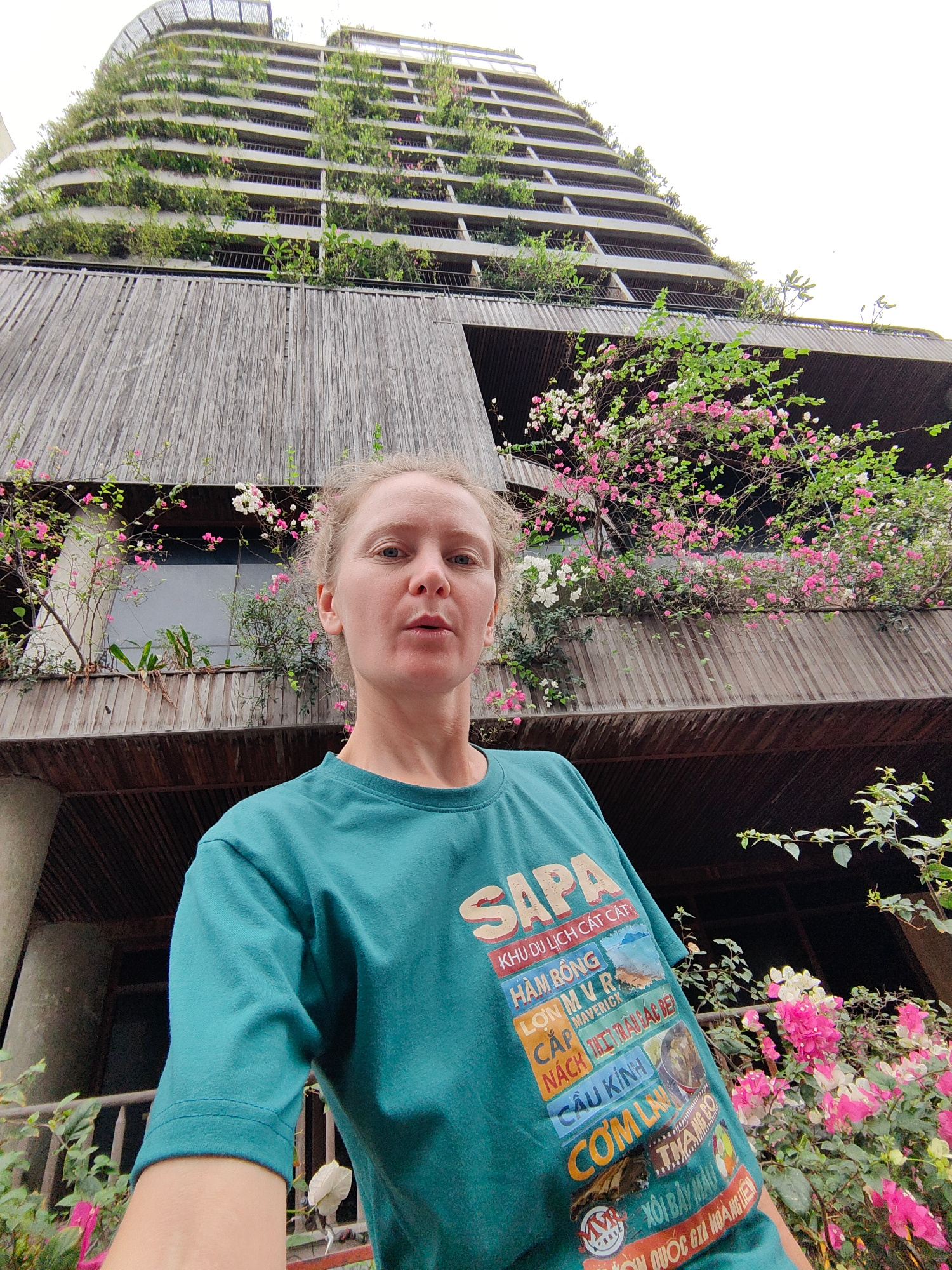 A person is standing in front of a building in Bai Chay Ward, Vietnam. The building features wooden cladding and balconies with plants and flowers. The person wears a green t-shirt with text related t…read more