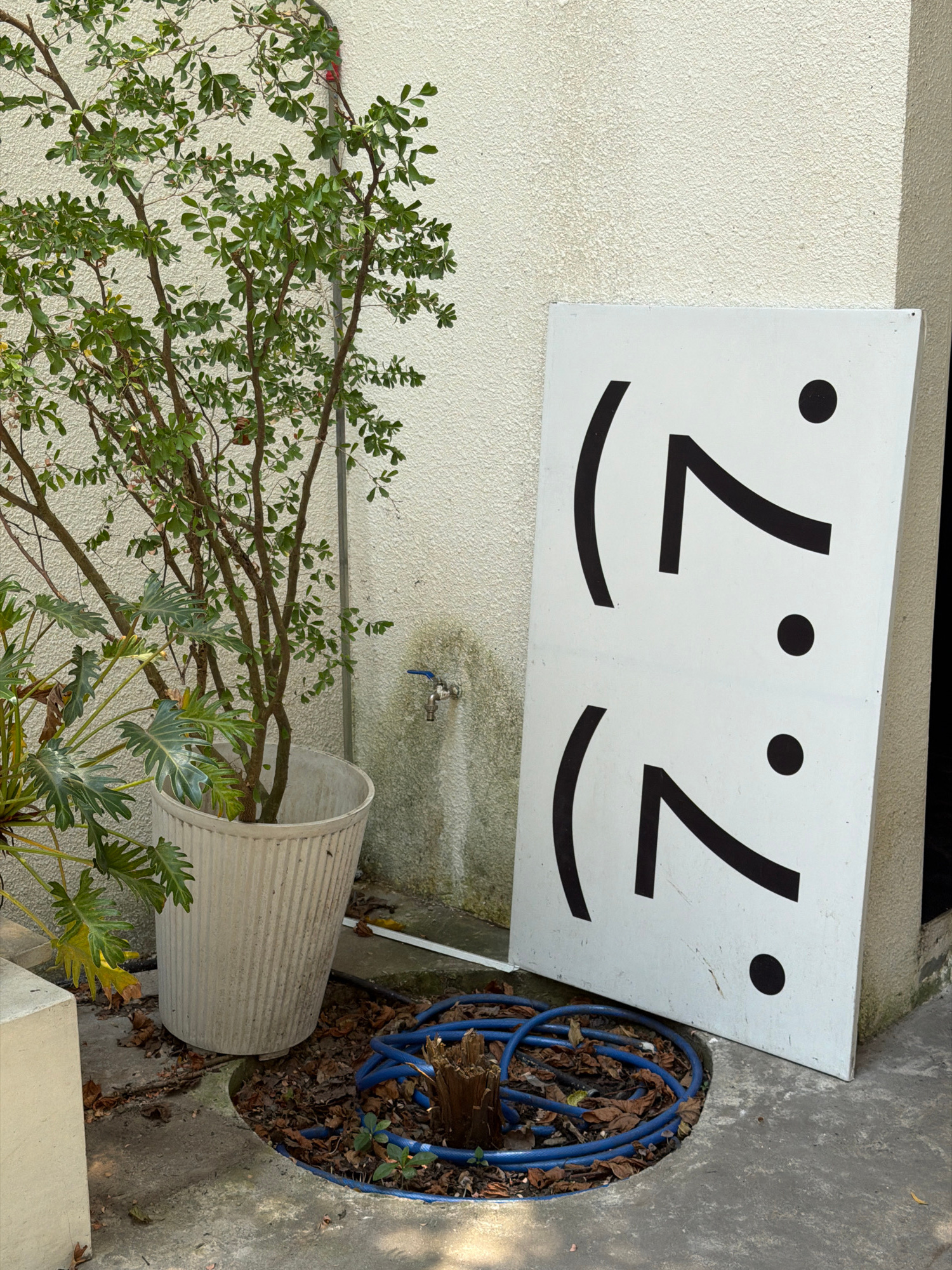 The scene depicts a white wall with a white sign displaying two minimalist face designs. Each face consists of a dot, a slanted line representing an eye, and a curved line for a smile. A metal faucet…read more