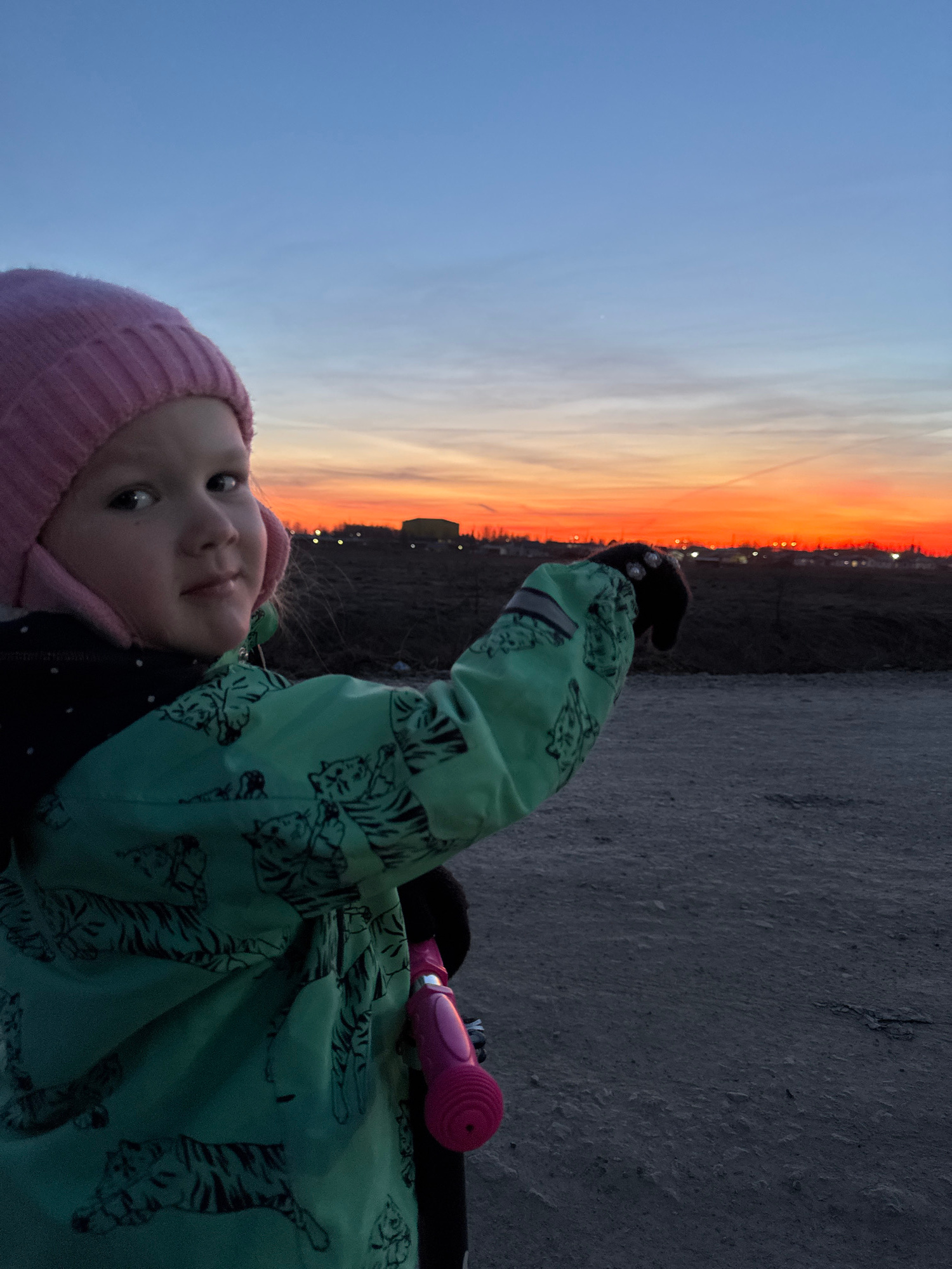This image depicts a young child outdoors during what appears to be a vibrant sunset or sunrise in Горный, Russia. The sky dominates the upper portion of the frame, showcasing a dramatic gradient from…read more