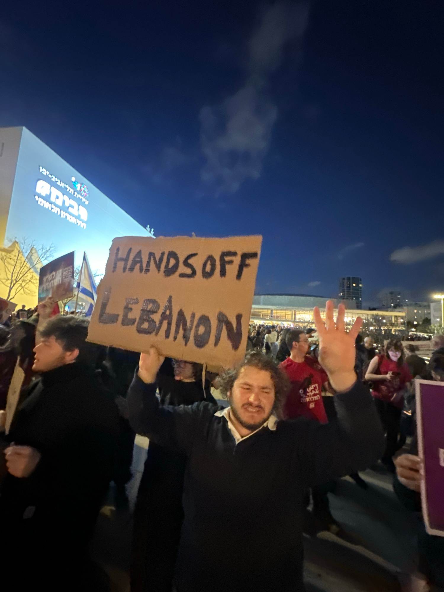 A medium shot photograph taken at night shows a man holding a cardboard sign that reads "HANDSOFF LEBANON" in black capital letters. The man has curly brown hair and a beard, and he is wearing a black…read more