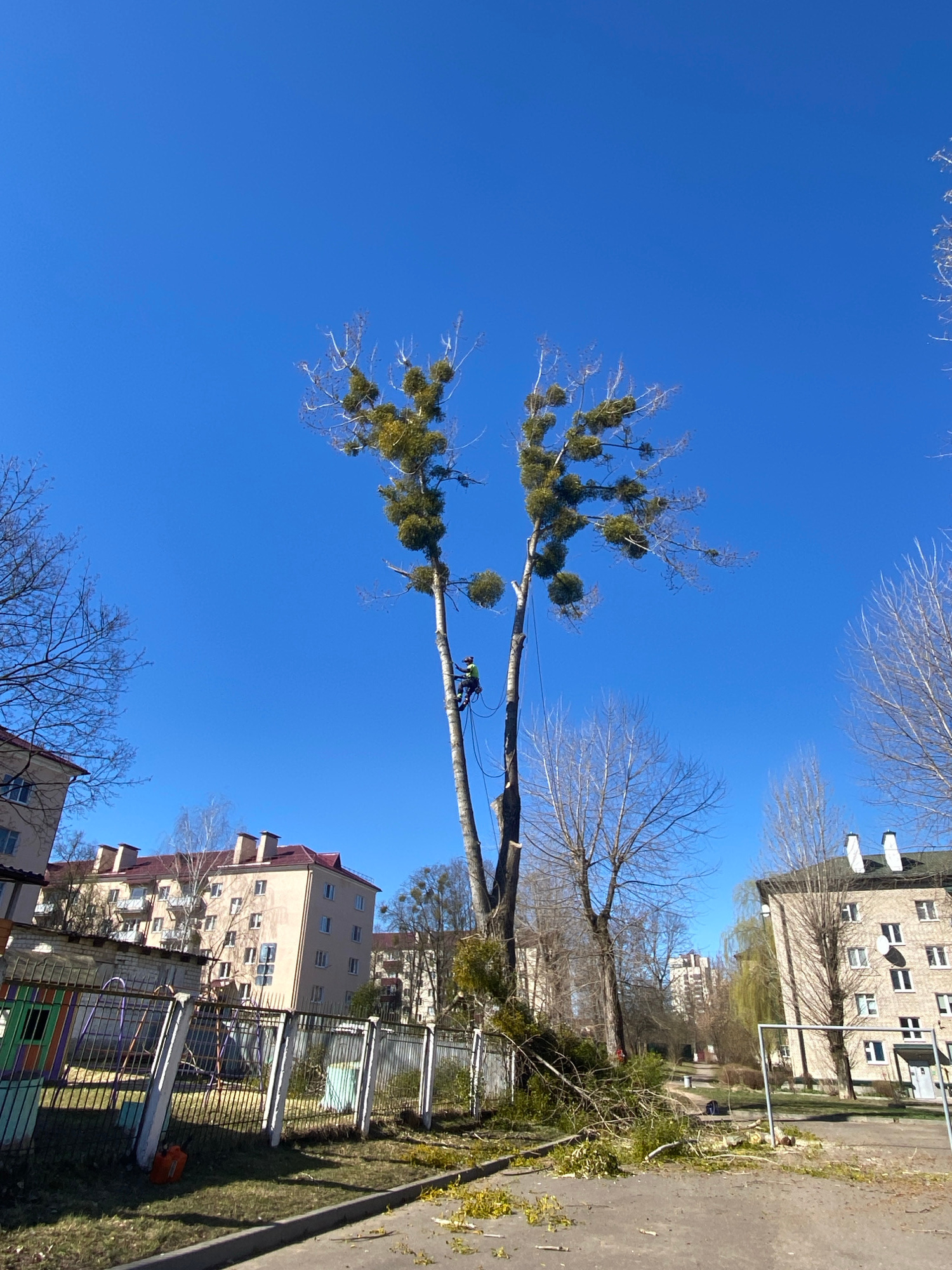 The image depicts a tree being pruned in an urban setting in Hrodna, Belarus, under a clear blue sky. A person is seen secured by ropes and equipment, positioned on a large branch to perform the pruni…read more