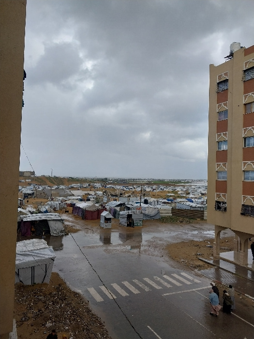 The image presents an elevated view of a temporary settlement in Khan Yunis, Palestinian Territory, under an overcast sky. In the foreground, the left edge shows a partial, plain beige building wall.…read more