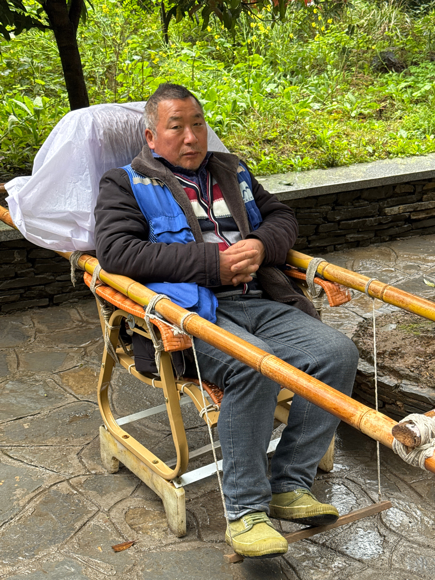 A man is sitting in a traditional bamboo sedan chair, possibly being transported through the Wulong District of China. The man is wearing a black jacket, blue vest, gray jeans, and green shoes. He app…read more