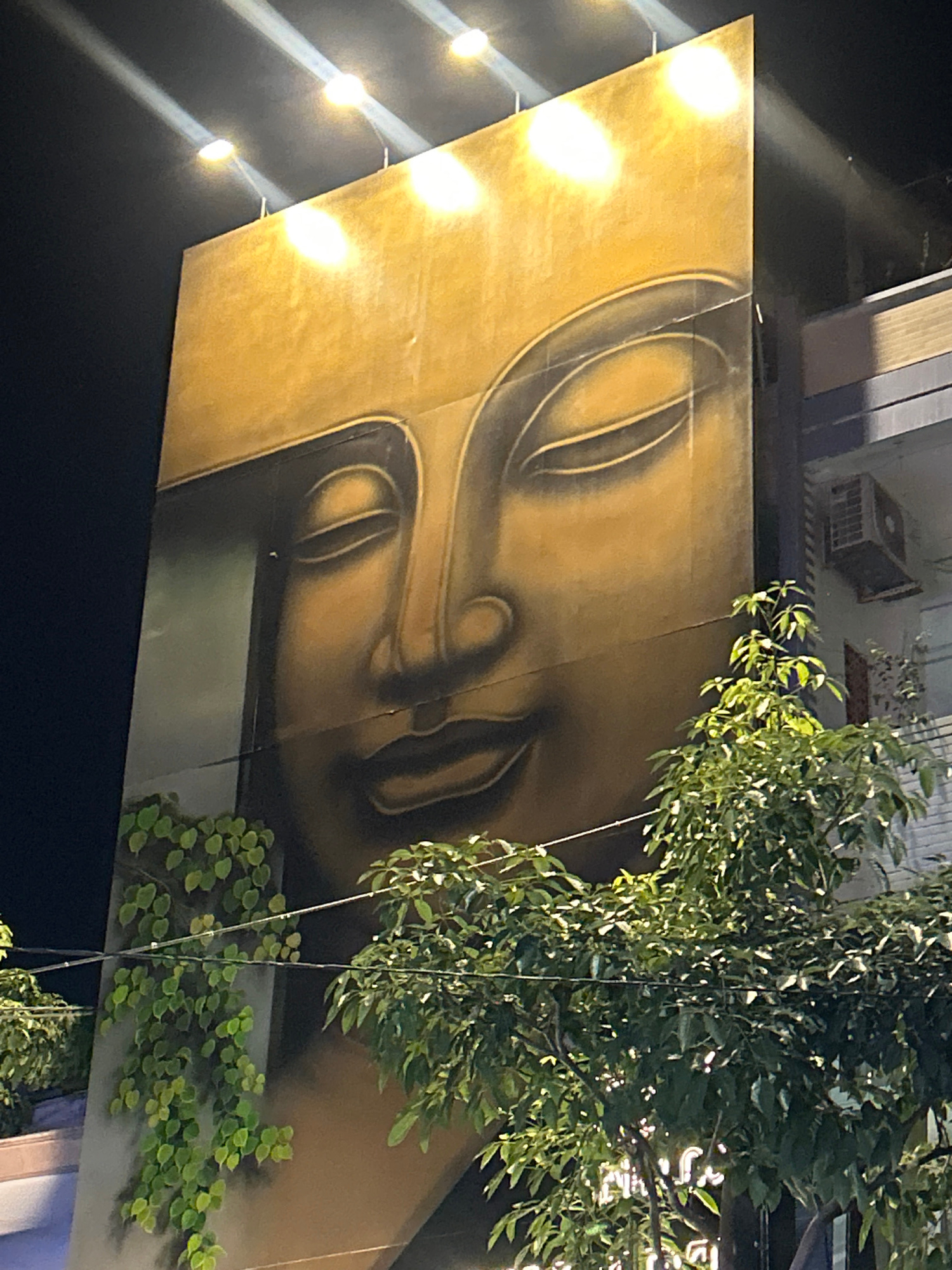 The image depicts a mural of a serene face, possibly Buddha, painted on a building facade in Nha Trang, Vietnam. The mural is predominantly gold and brown. A lush tree partially obscures the right sid…read more