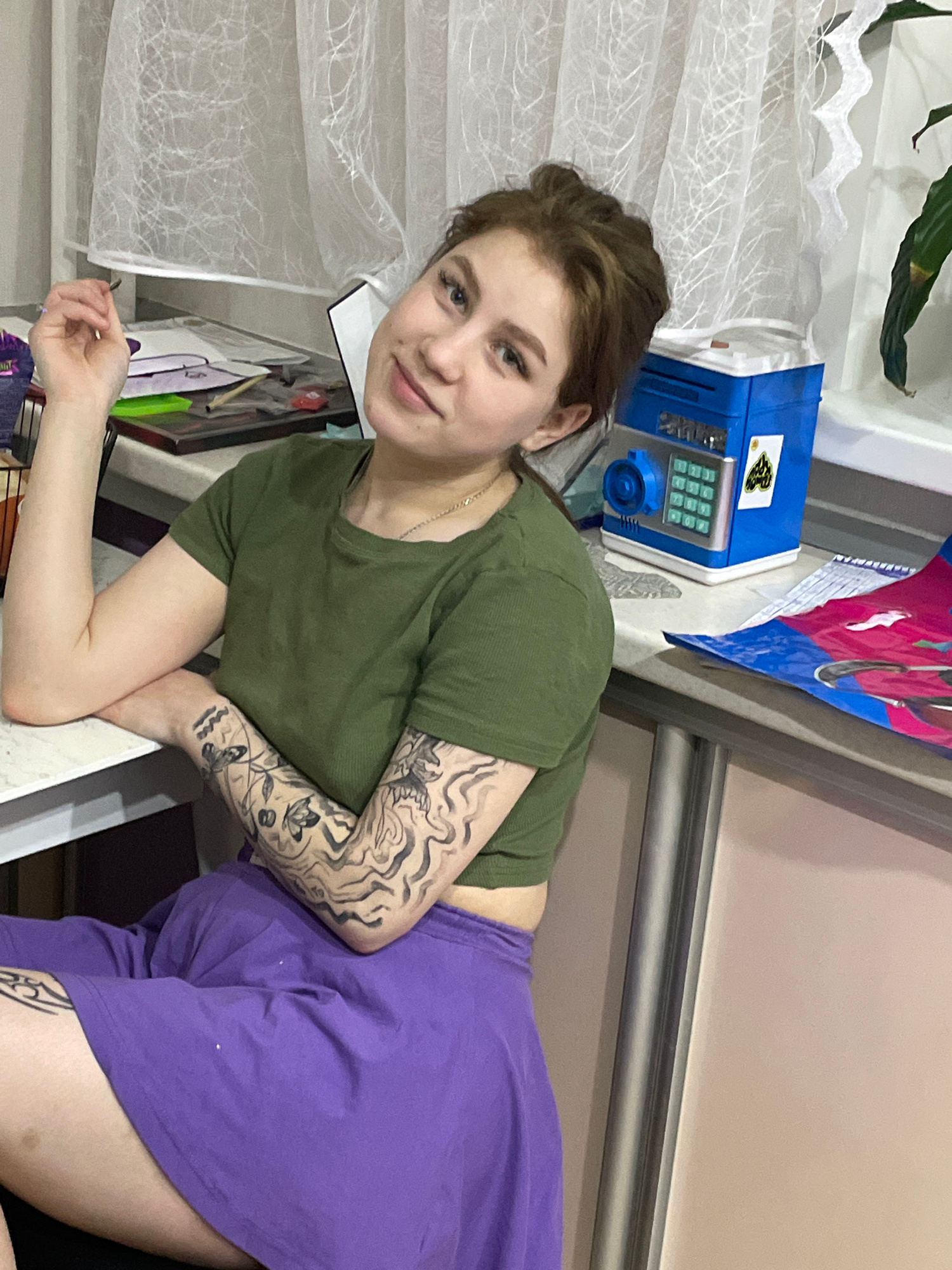 A young woman with brown hair is leaning against a white surface. She is wearing an olive green t-shirt and purple shorts. She has tattoos on her left arm. A blue toy cash register sits on a white she…read more