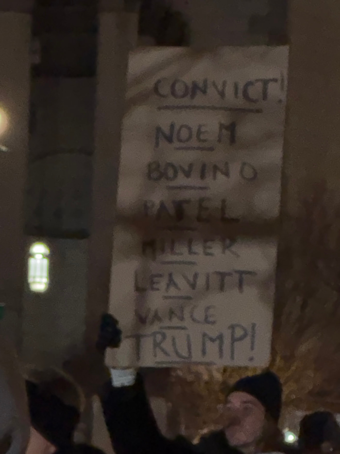 A political sign is visible, protesting. It reads "CONVICT!" at the top, followed by a list of names: "NOEM," "BOVINO," "PATEL," "MILLER," "LEAVITT," "VANCE," and lastly, "TRUMP!" The sign is held by…read more
