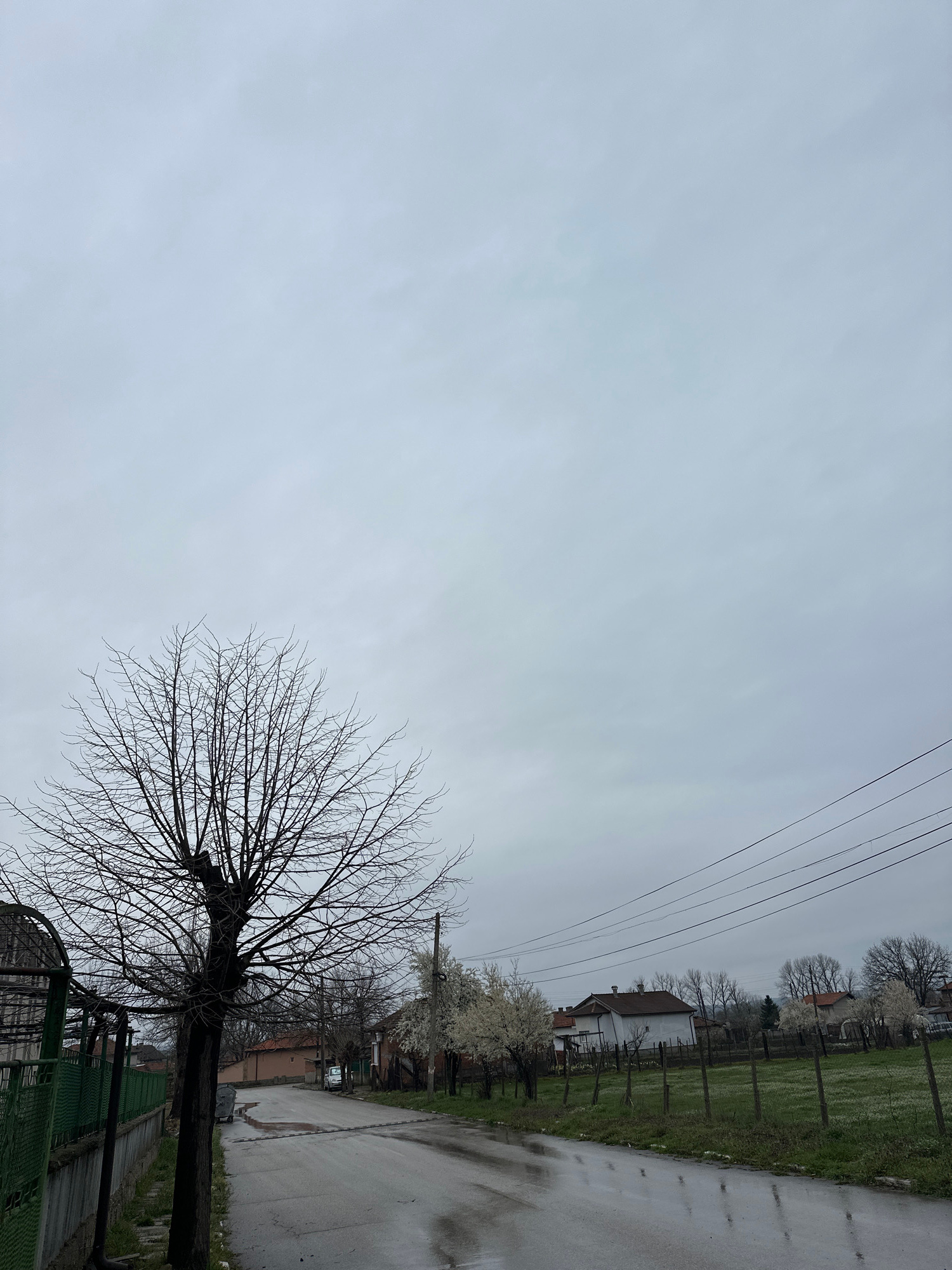 The image captures a street scene, likely taken in Malevo, Bulgaria. The sky is overcast, suggesting a rainy or post-rain atmosphere, with a large tree prominently positioned in the lower right foregr…read more