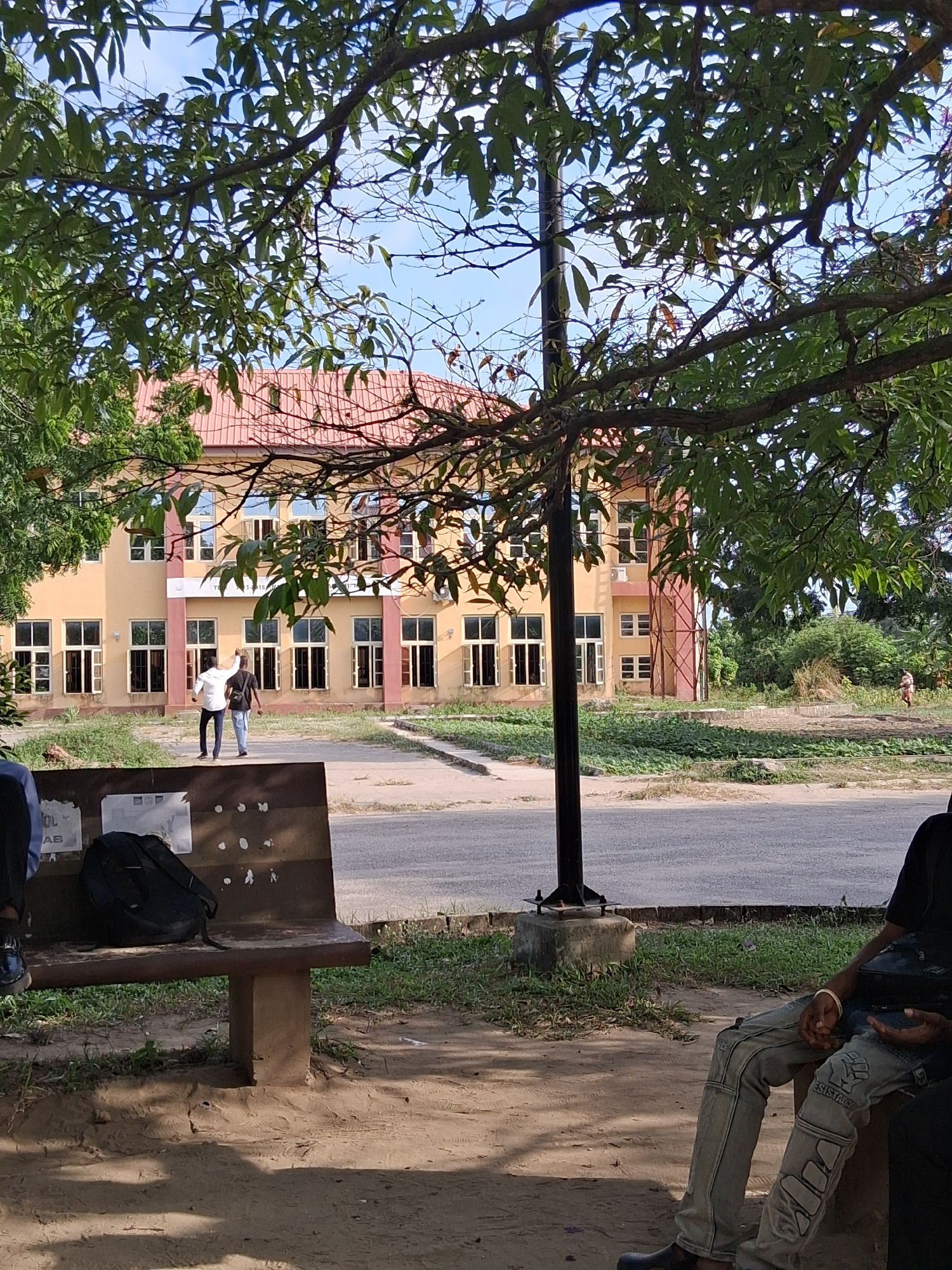 The image, taken during daylight hours, depicts an outdoor scene in Lagos, Nigeria. A four-story building with a red roof and yellow facade, adorned with numerous windows and a white banner, stands as…read more