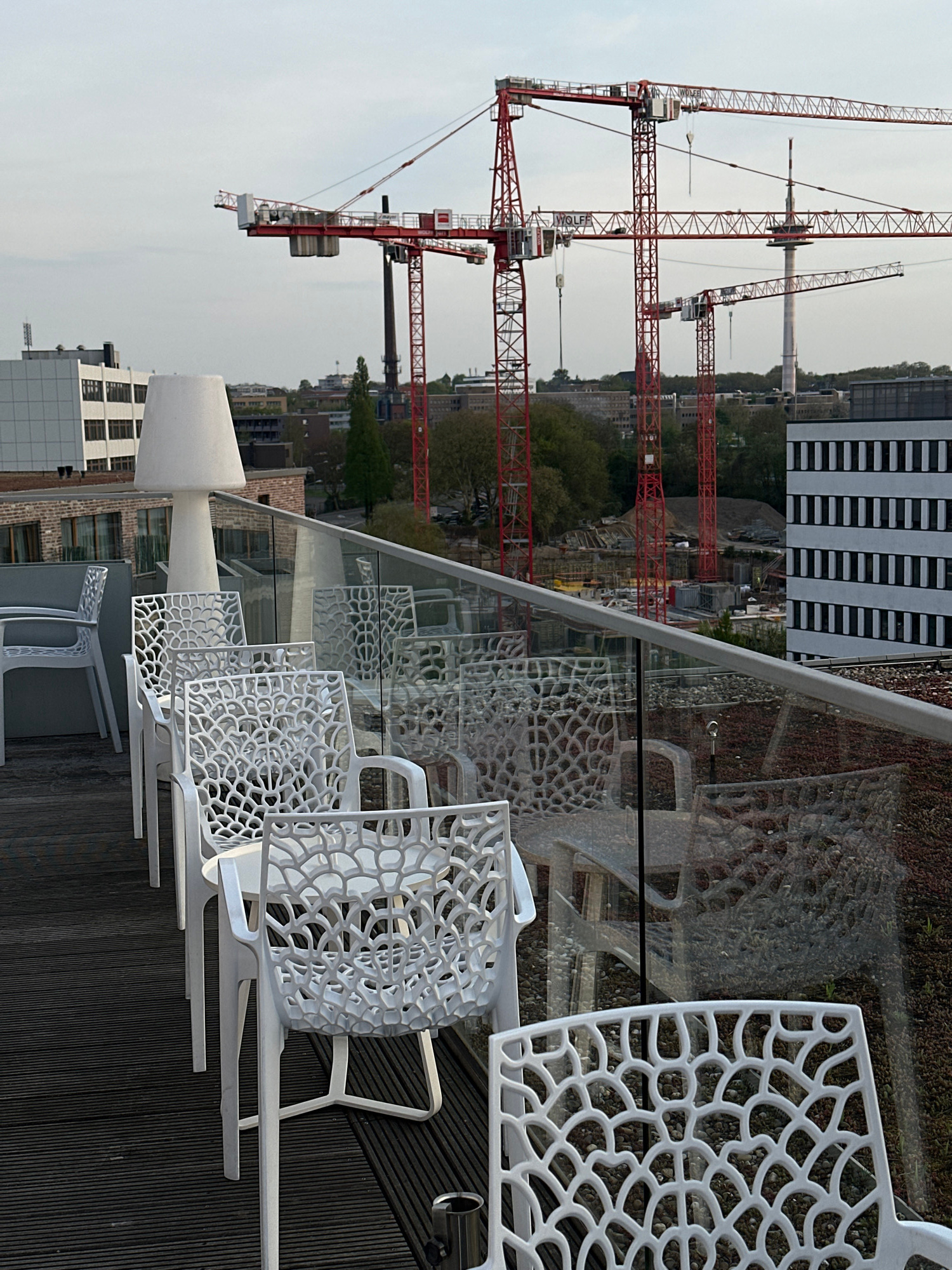 The image depicts an elevated outdoor seating area, likely a rooftop terrace or balcony, overlooking a cityscape. Foreground elements include several white, intricately designed chairs arranged in a r…read more