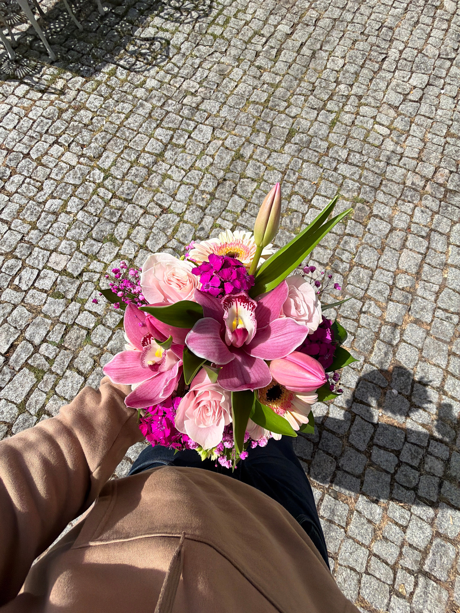 A person holds a bouquet of flowers over a cobbled pavement. The bouquet features pink orchids, roses, tulips, gerberas, and small purple flowers. The person is wearing a tan-colored jacket and dark j…read more