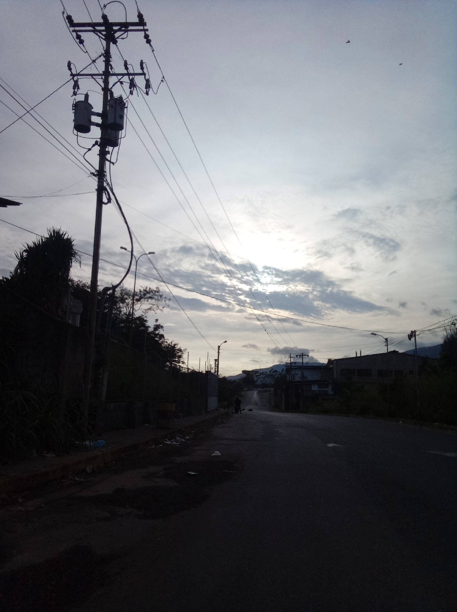 The image depicts a street scene in the Parroquia Guatire, Venezuela. An asphalt road stretches into the distance, leading uphill towards buildings and a distant mountain range partially obscured by c…read more