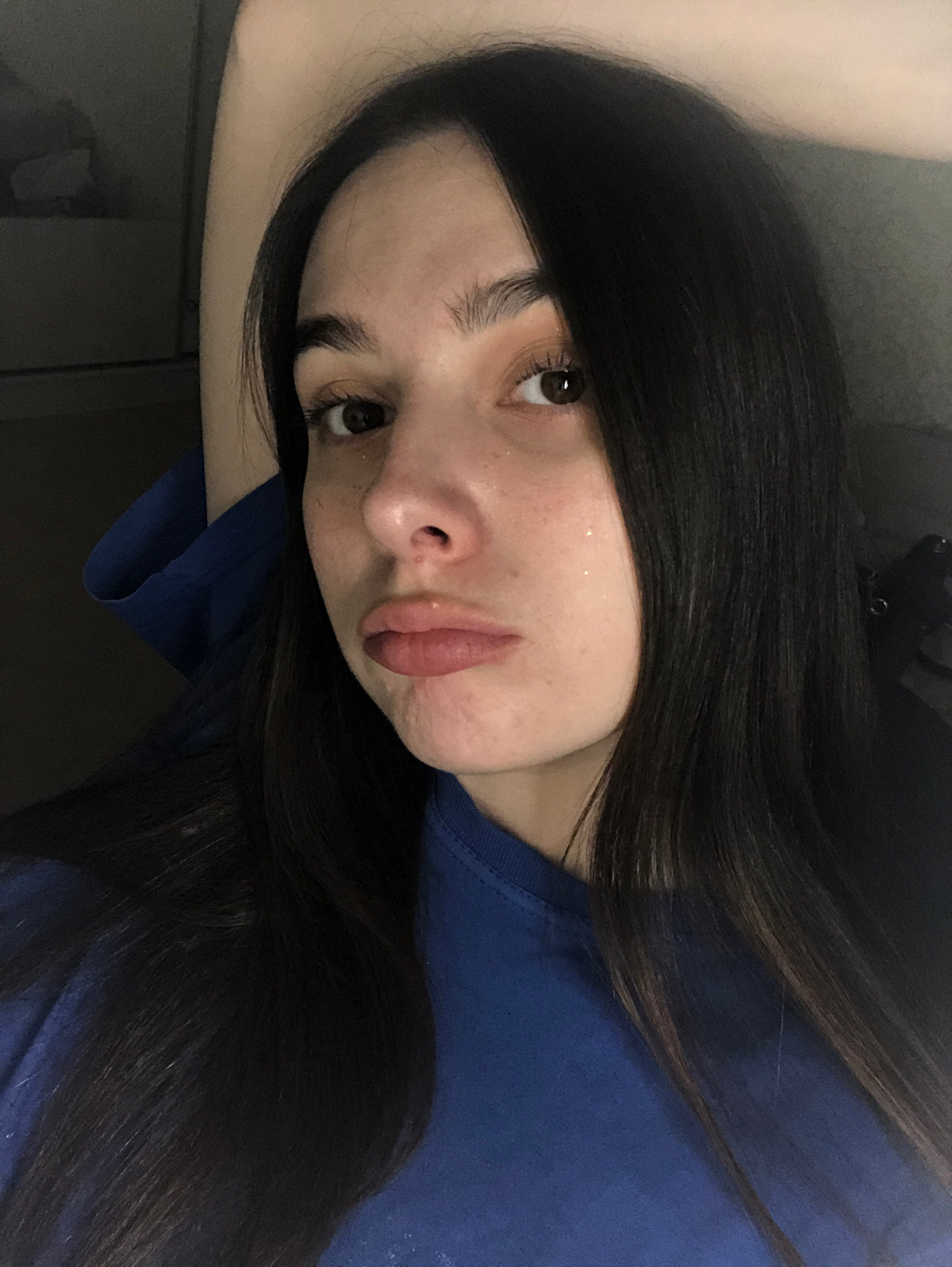 A young woman lies down wearing a blue shirt. Her long, dark hair spreads around her head. She has light skin, brown eyes, and appears to be wearing some glitter on her face. She is looking slightly u…read more
