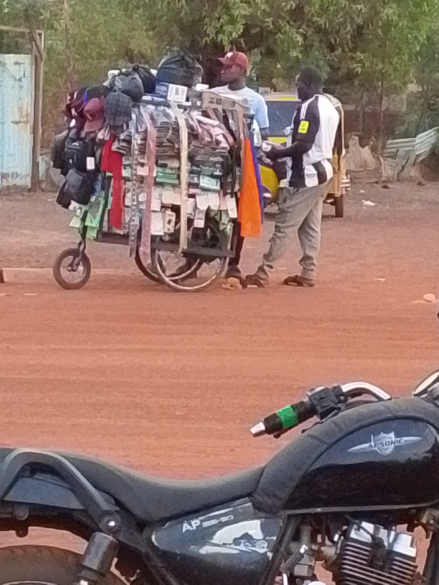 The image shows a street scene in Tamale, Ghana. A vendor is standing next to a three-wheeled bicycle cart loaded with merchandise, including bags, hats, and belts. The cart is densely packed, with it…read more