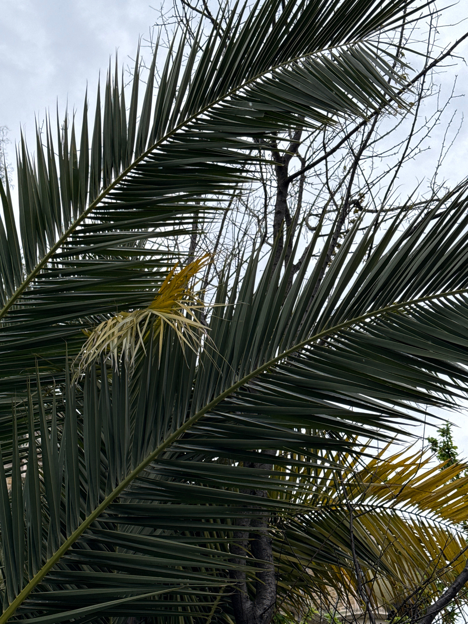 The image captures an upward view into a canopy of trees, featuring prominent palm fronds against an overcast sky. In the foreground, several large, dark green palm fronds with pointed leaflets stretc…read more
