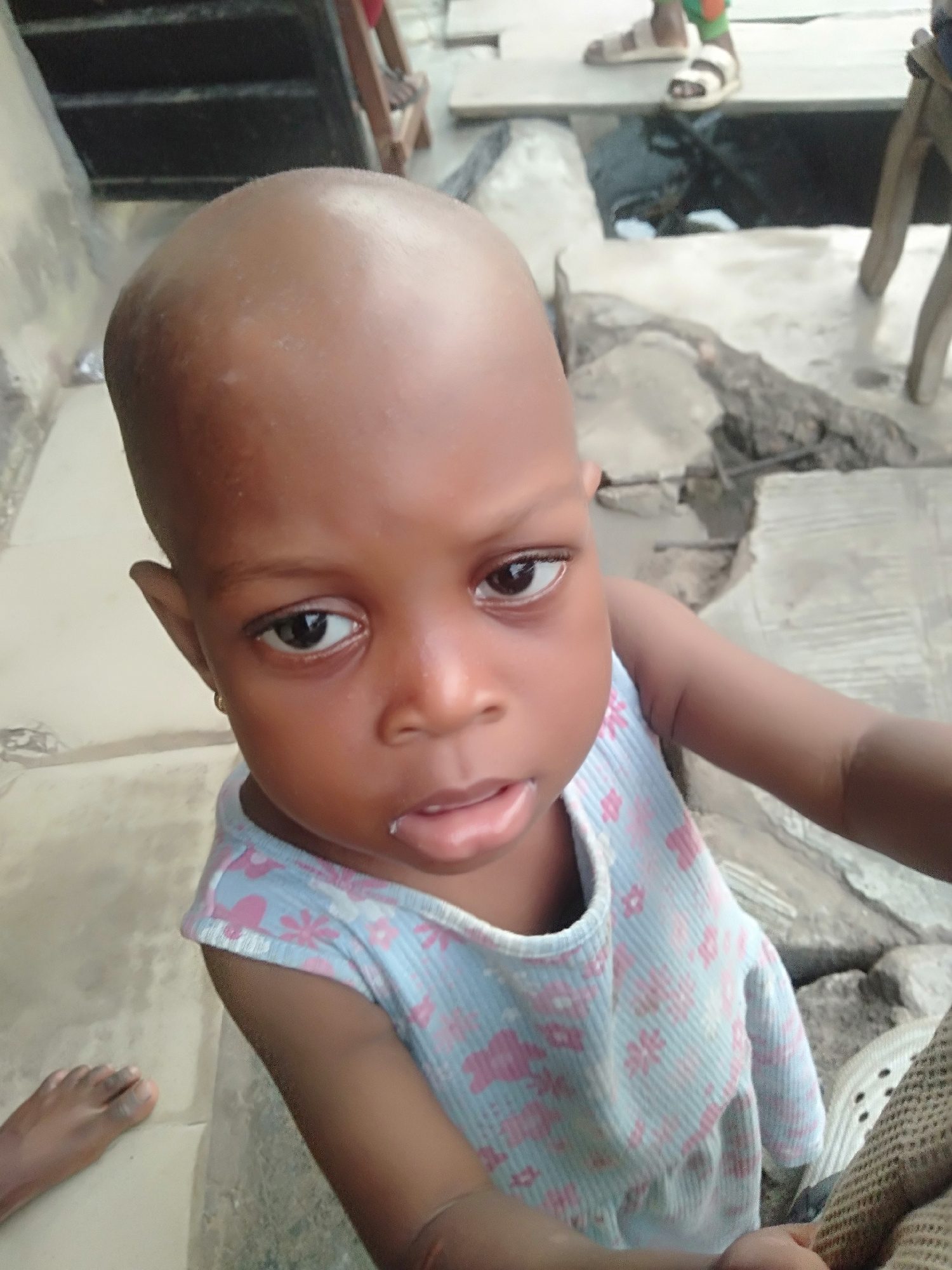 A young, bald-headed child with dark skin is the primary subject of this eye-level, outdoor shot. The child is wearing a light blue top with pink floral patterns and is looking directly at the camera.…read more