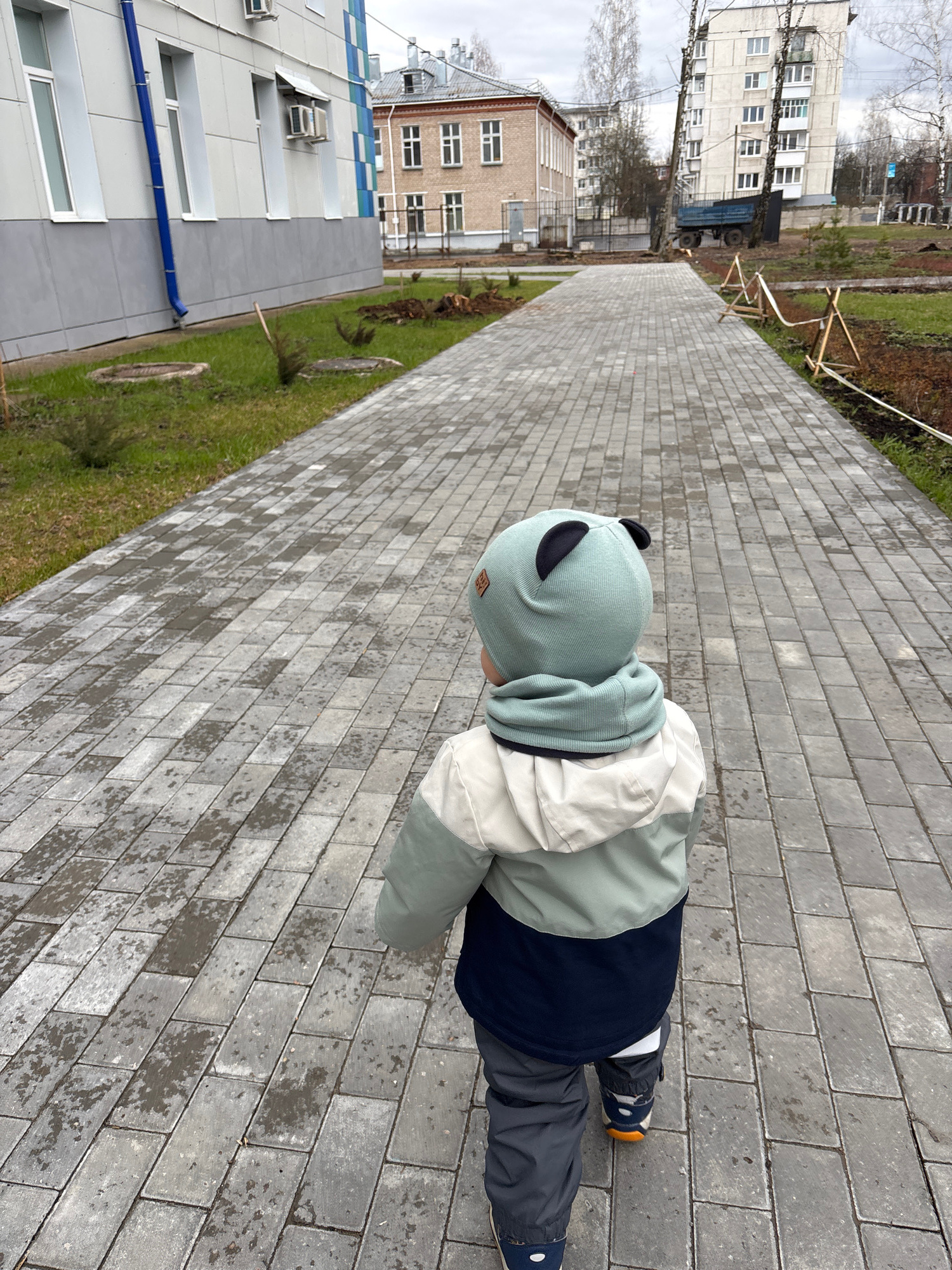 A young child, seen from an overhead perspective, walks or stands on a paved walkway. The child wears a light blue or mint green beanie hat with black, panda-like ears, a two-toned jacket that is lighβ¦read more