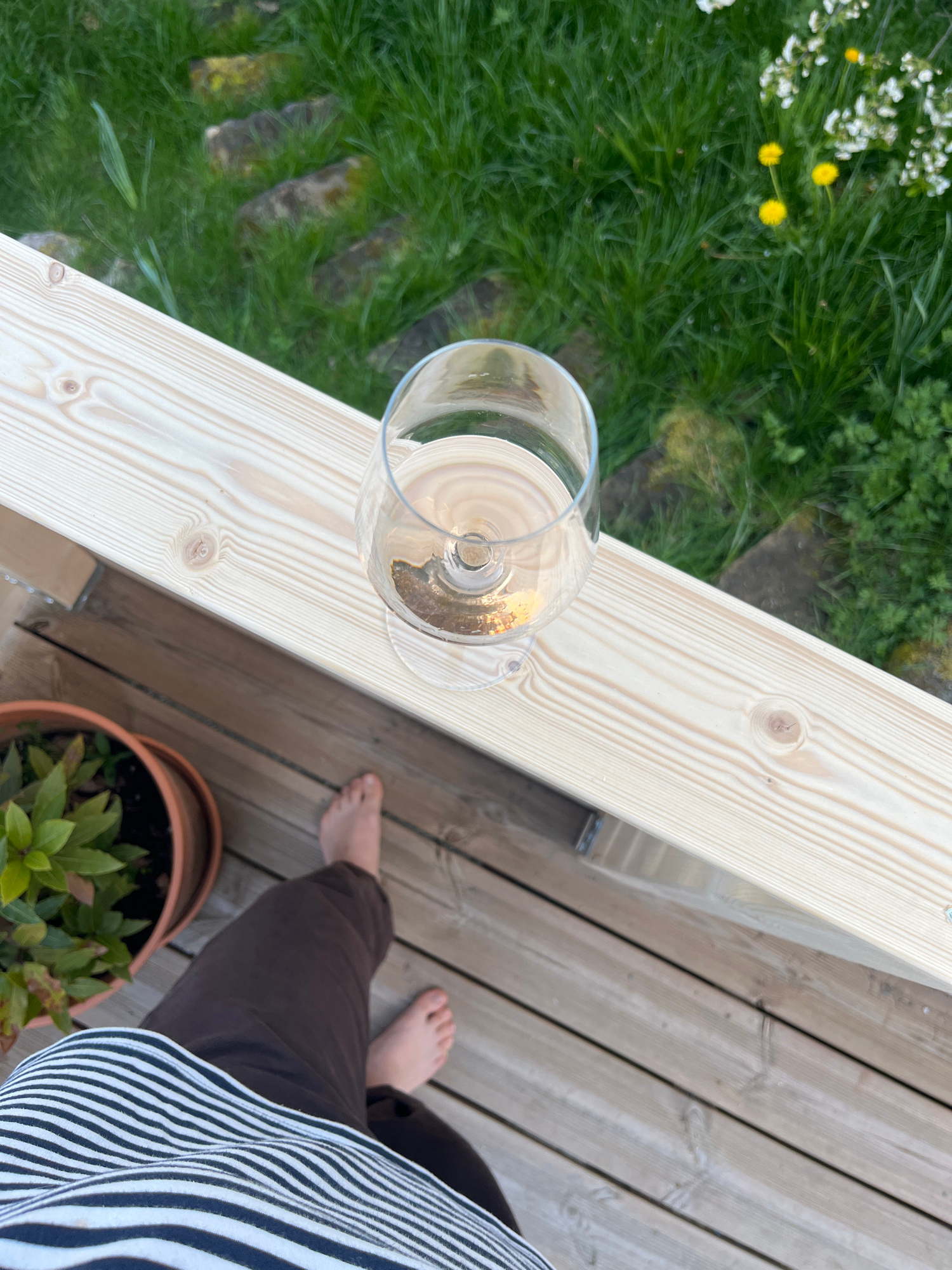 An overhead photograph captures a serene outdoor scene on a wooden deck in Gangloff, Germany, looking down towards a grassy area. A person is visible from the waist down, their bare feet resting on th…read more