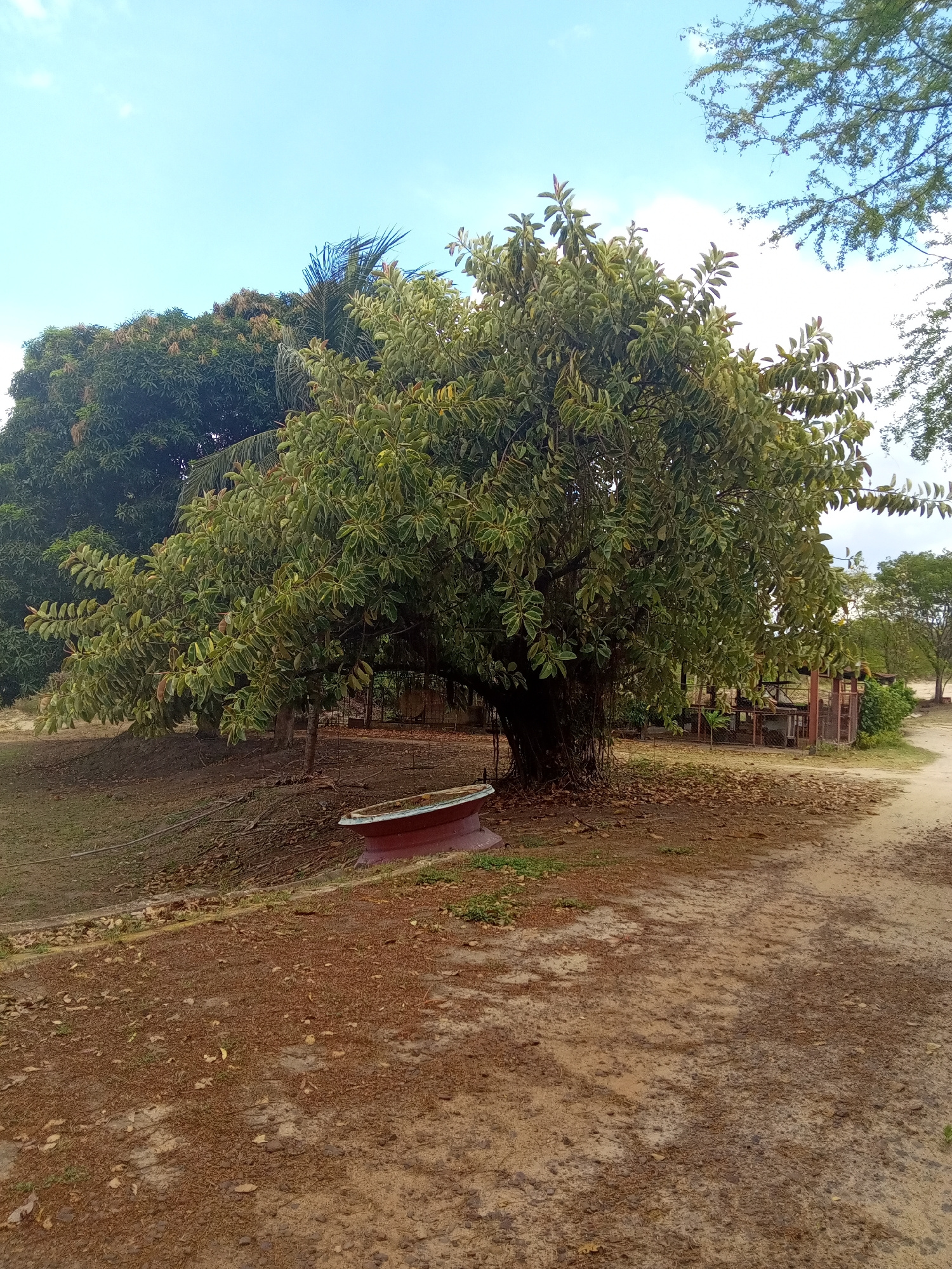 The image depicts a rural scene in Guayana City, Venezuela. Dominating the foreground is a large, mature tree with dense, green foliage. Beneath the tree sits a red and white planter. The ground is pr…read more