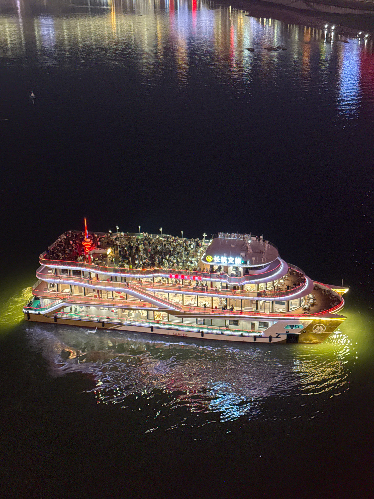 At night, a multi-story tour boat illuminated with decorative lights is sailing on a river near Yuzhong District, China. The boat is packed with people on its decks. Reflections of other lights are visible in the dark water on the opposite bank. Ripples and churning water are near the boat, suggesting it is moving. The immediate area around the boat is illuminated by green and gold lights. The overall scene is dark. | Open Wire