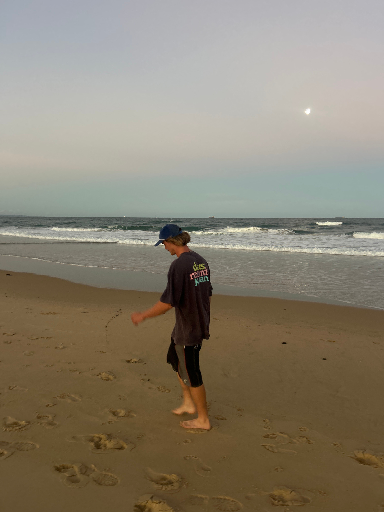 A young person stands barefoot on the beach at Woonona, Australia. They wear a dark-colored t-shirt, dark shorts, and a blue baseball cap. They appear to be in motion, with their arm extended forward.…read more