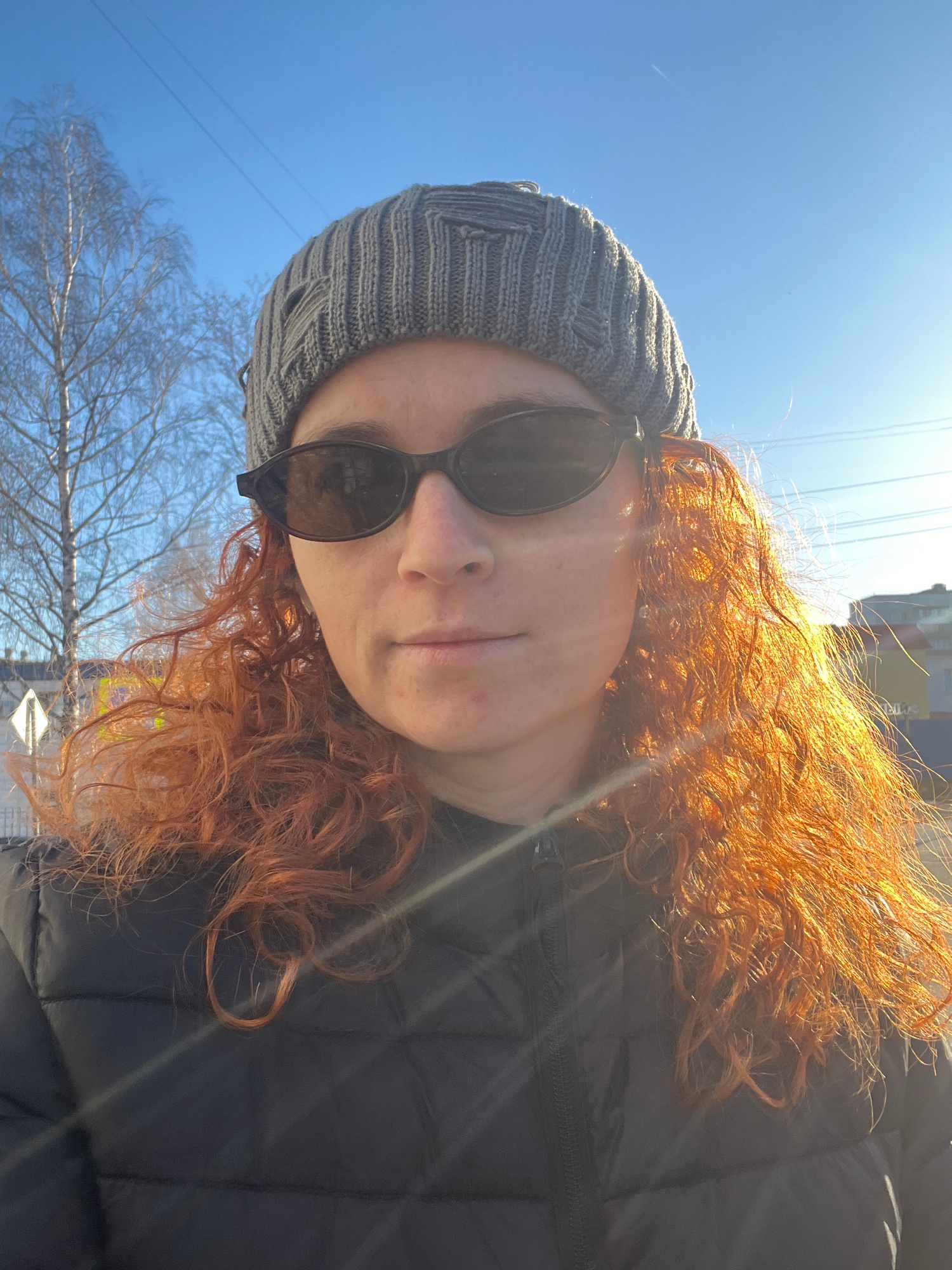 A rotated outdoor portrait shows a person with long, voluminous, curly reddish-orange hair, wearing a grey knitted beanie and dark rounded sunglasses. The person is looking directly at the camera, wit…read more