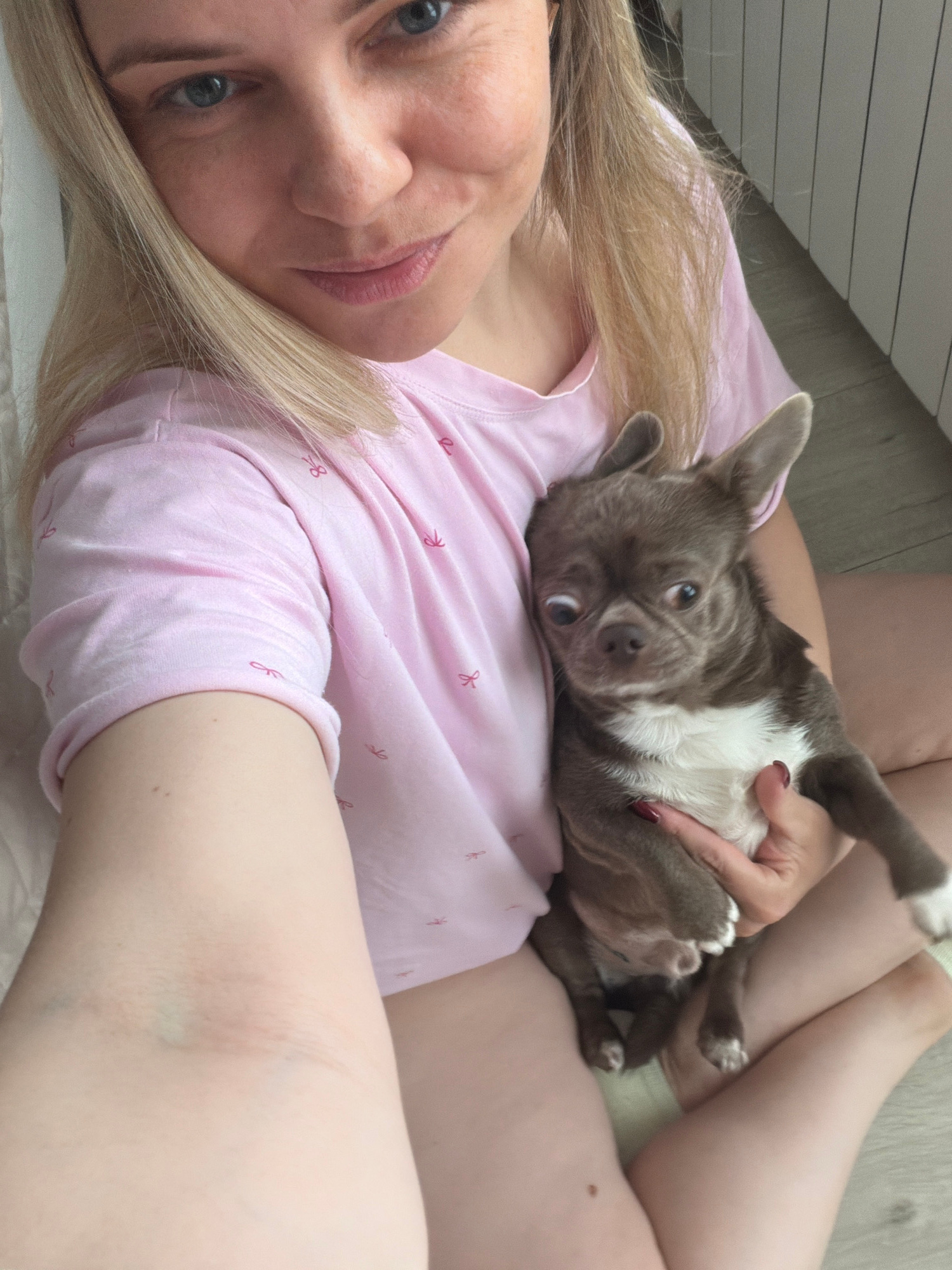 A woman with blonde hair, wearing a pink t-shirt with a bow pattern, is holding a brown and white chihuahua-like puppy. The puppy is lying on its back. The woman is in an indoor location, possibly a h…read more