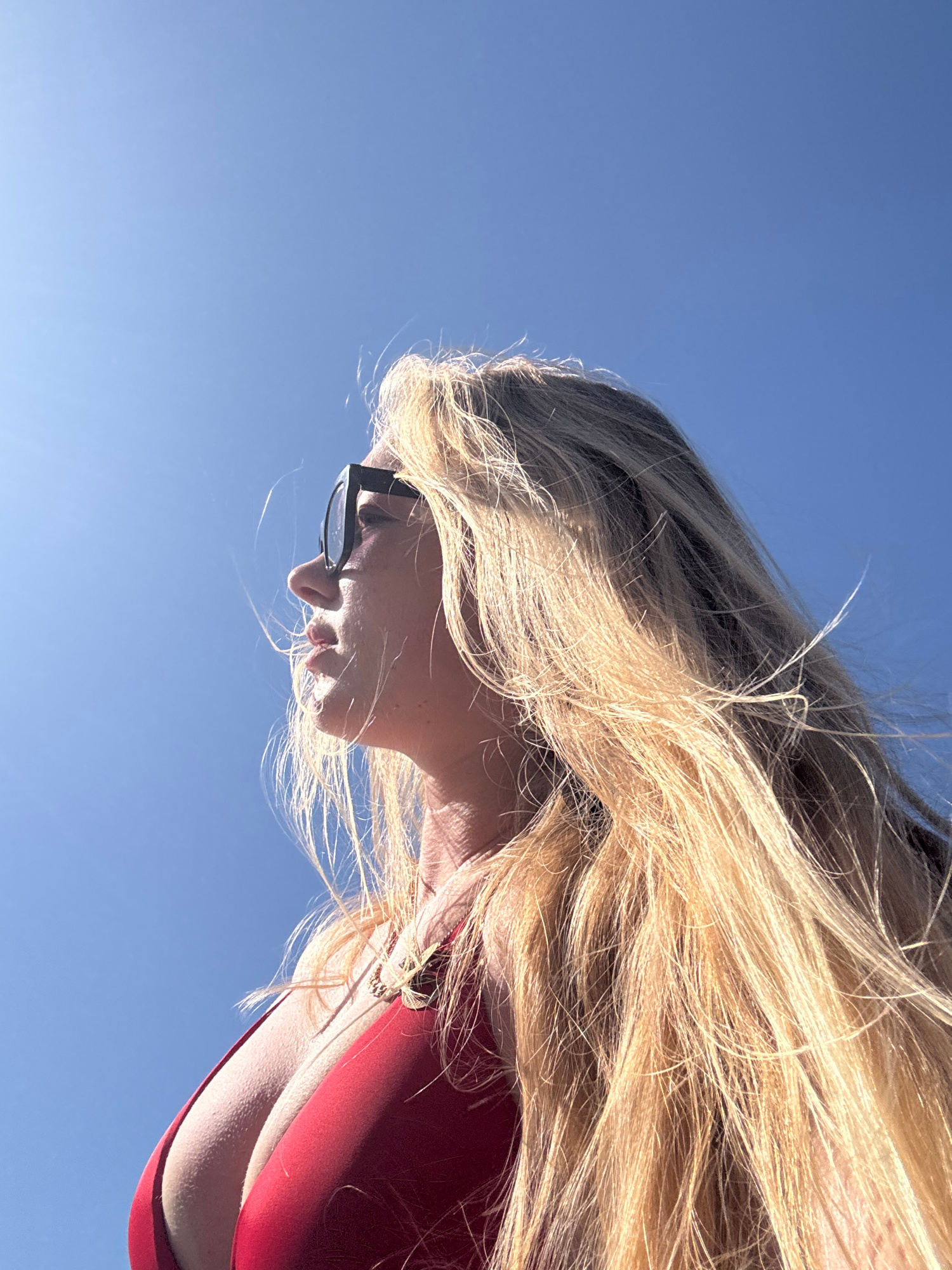 A low-angle shot depicts a woman with long, blonde hair wearing sunglasses, seen against a clear blue sky. The woman is wearing a red garment. The specific location is unknown.