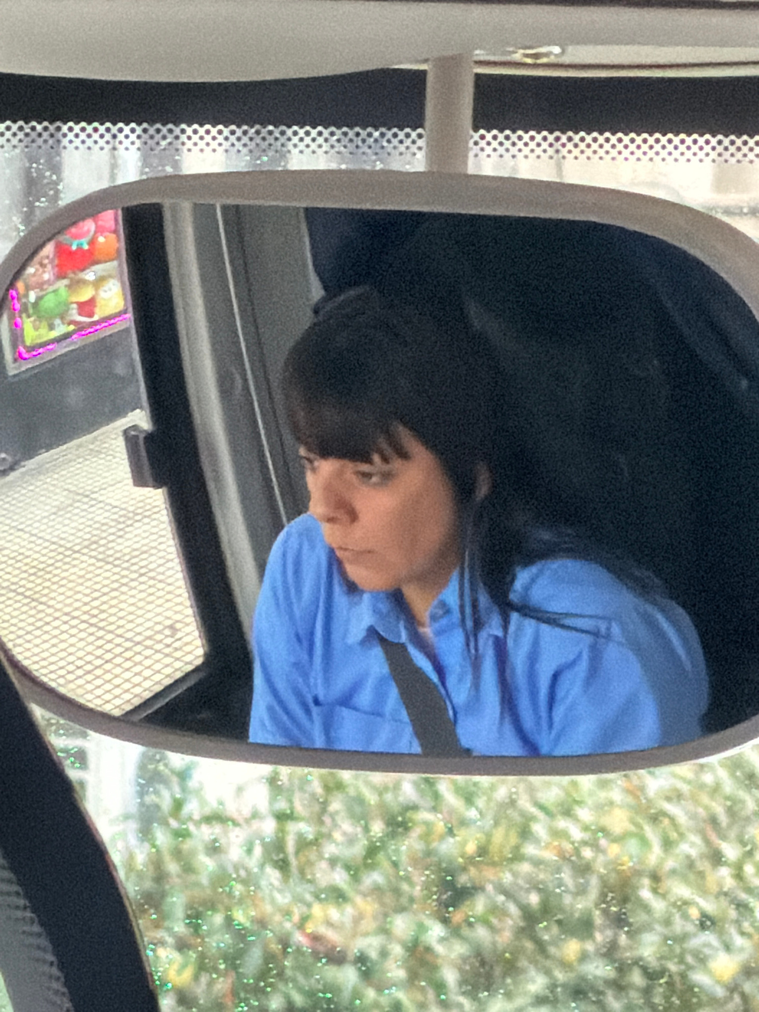 The image captures a reflection in a vehicle's rearview mirror, rotated horizontally. The primary subject is a person, likely the driver, reflected in the mirror. They have dark hair and appear to be…read more